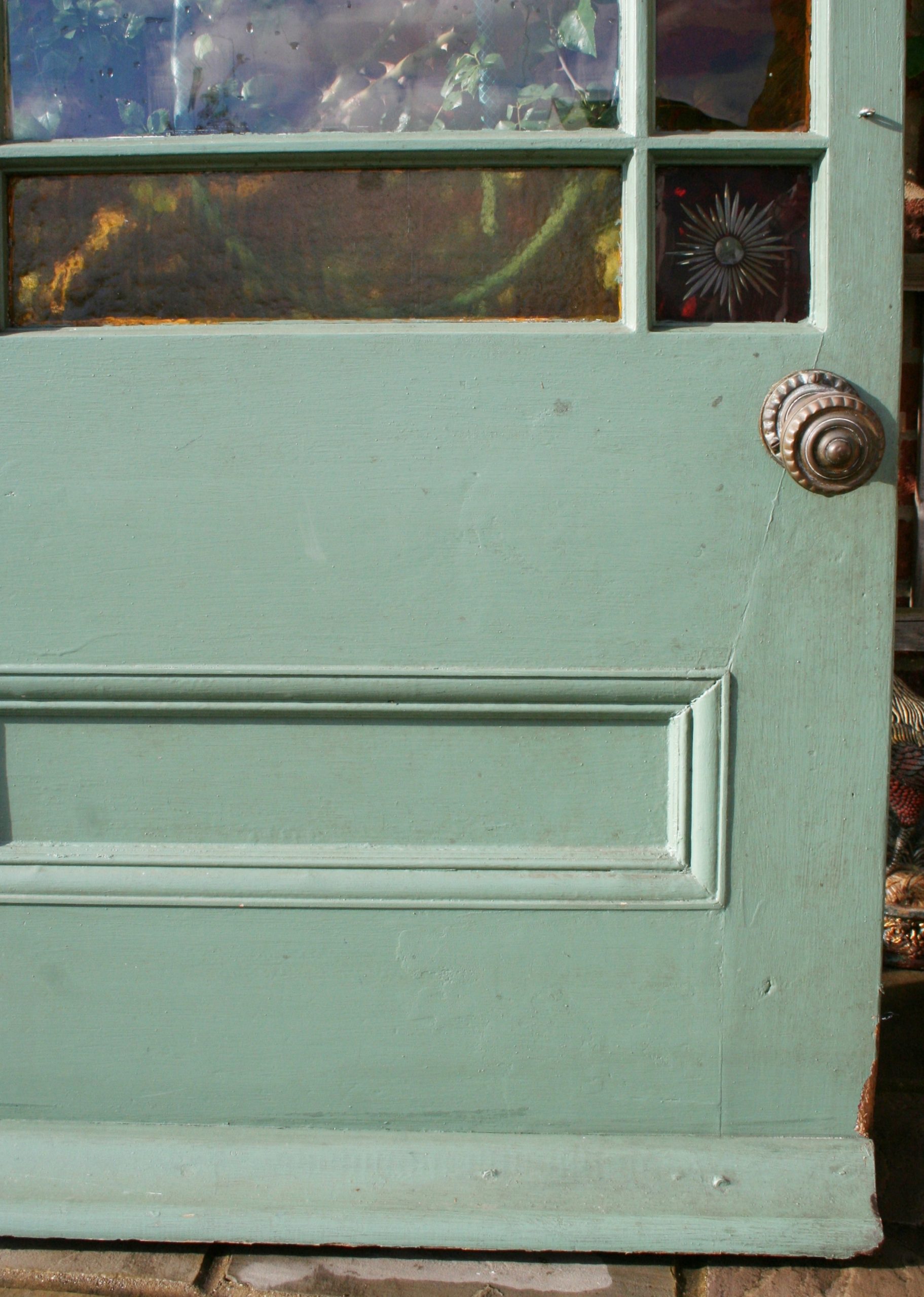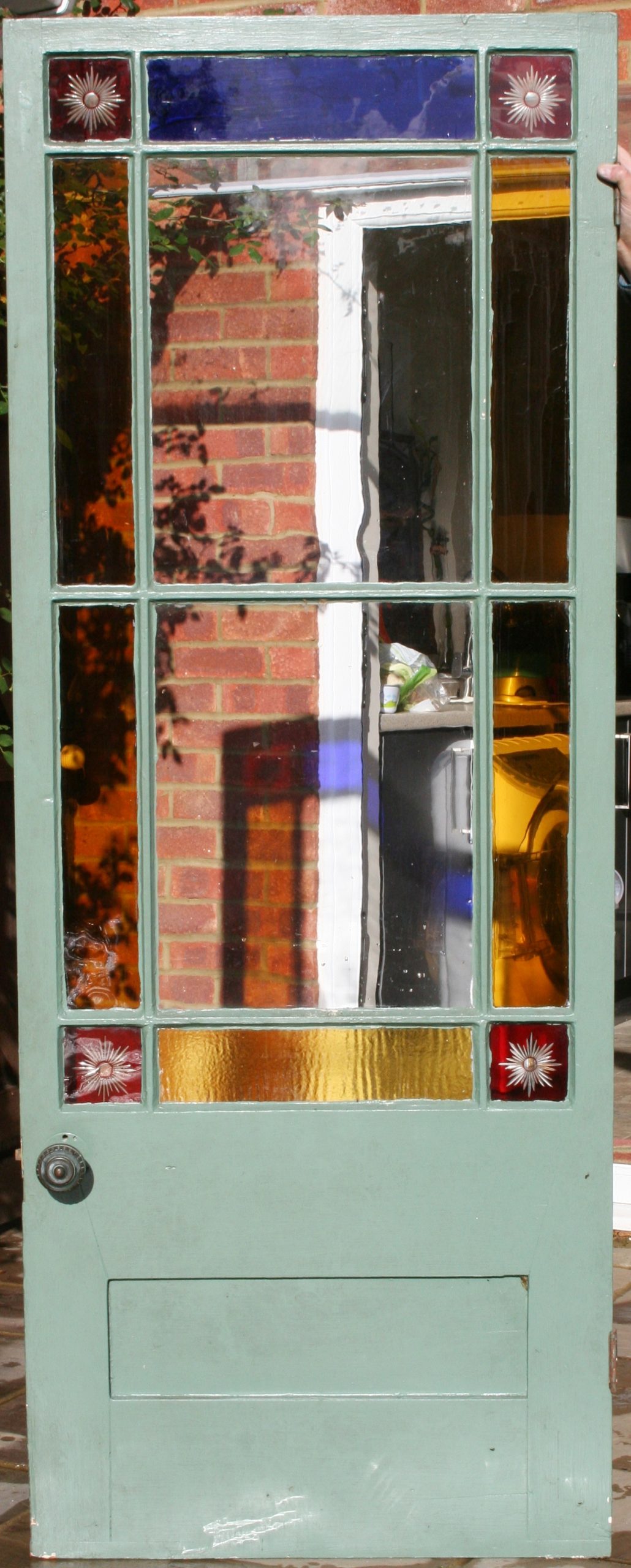 Victorian painted pine door, ¾ glazed. Upper part has 12 glazed panels comprising of 4 ruby red brilliant cut acid etched stars, amber flash glass, Cobalt blue glass border panels and hand made clear central panes, with the lower half of the door featuring a bevelled panel. Painted a sage green, but could be easily sanded down and repainted. Hinges attached and ornate cast brass knobs both sides.
