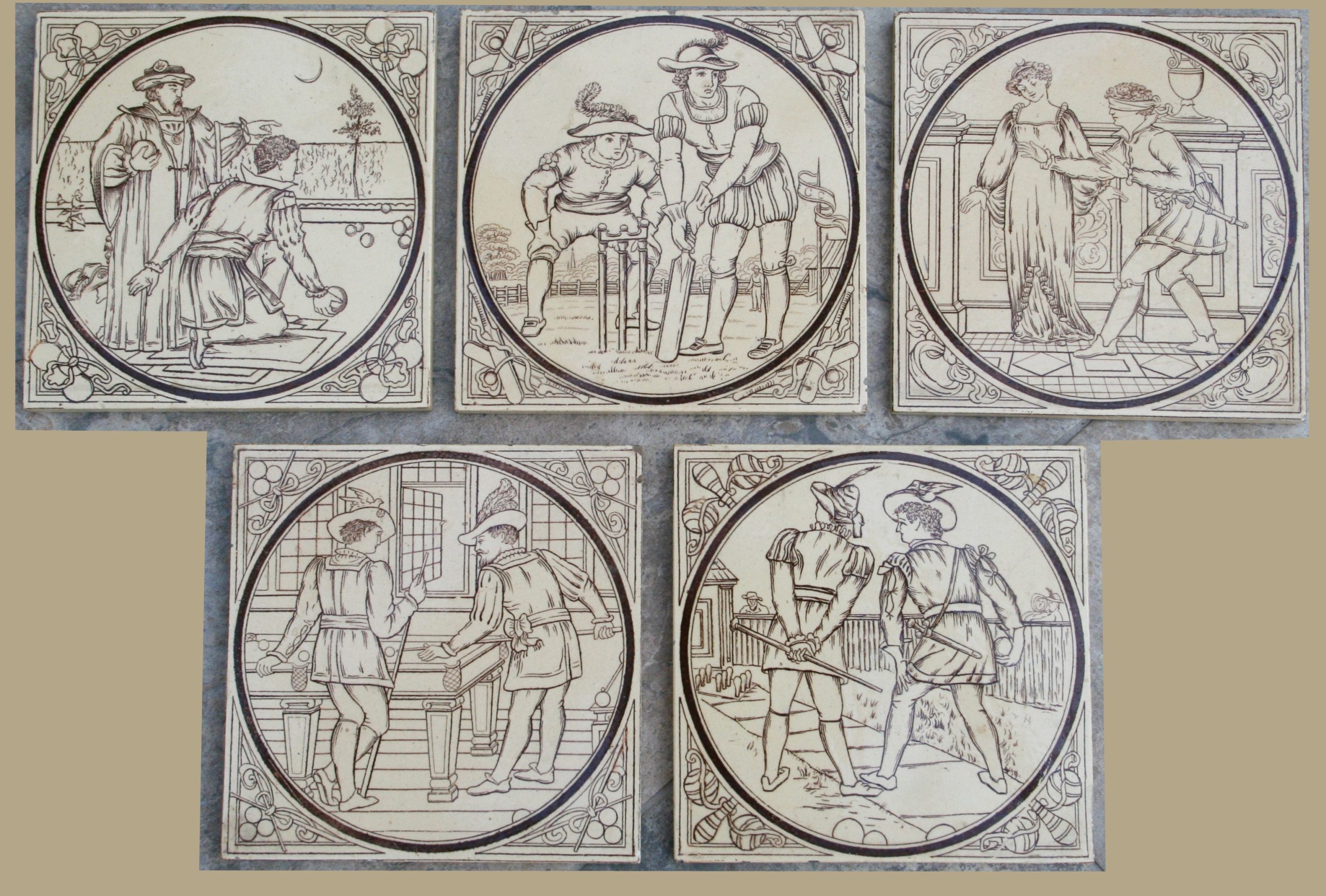 5 Minton tiles designed by John Moyr Smith featuring Medieval sports, printed in brown on a cream background. The reverse reads – Minton, Hollins & Co. Patent Tile Works Stoke On Trent.