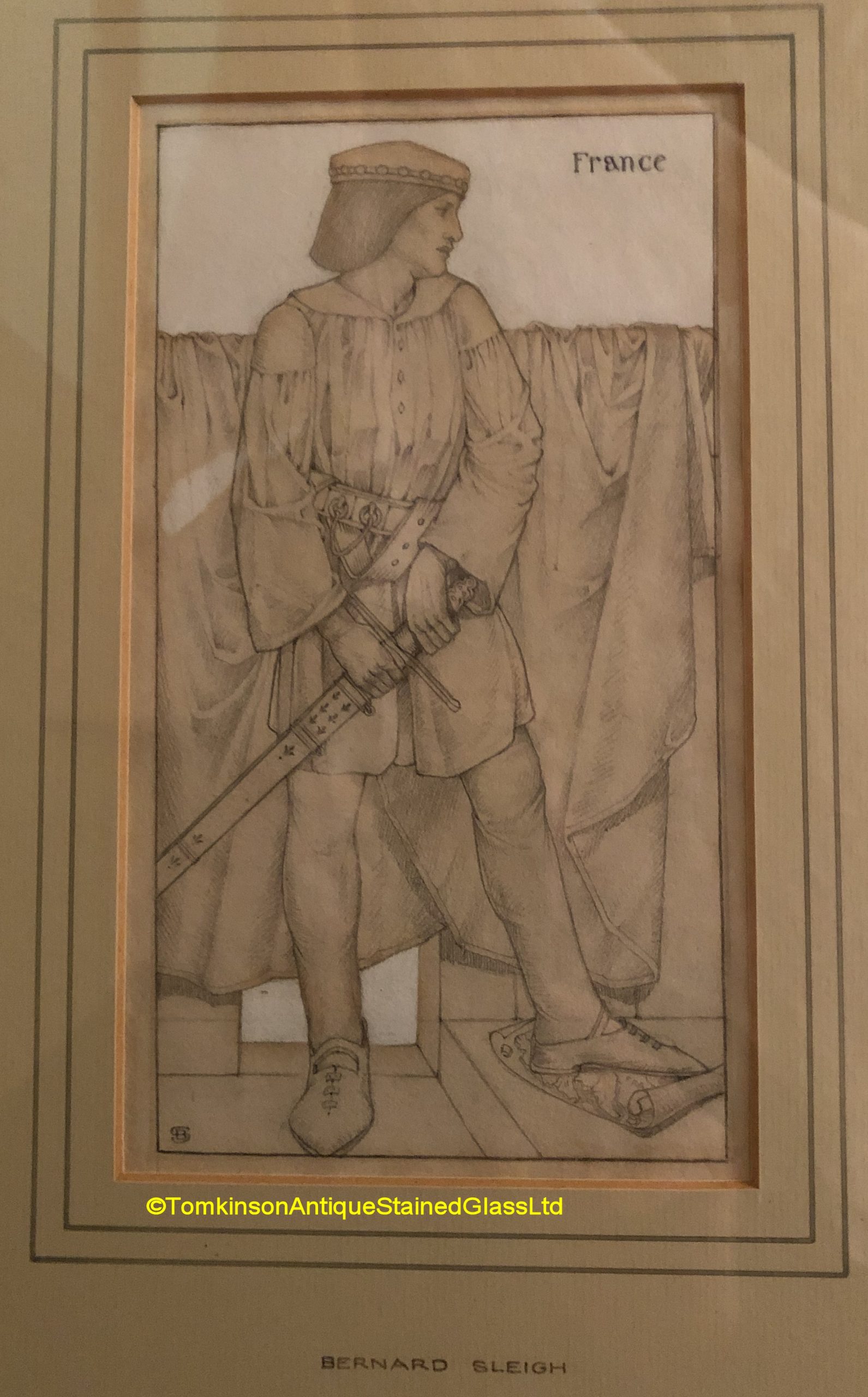 Antique window leaded with hand painted stained glass depicting a figure (possibly Joan of Arc) holding a sword. On a pillar to the side is an image of a Valkyrie, a Norse female figure who choose those who may die in battle and those who may live. Bernard Sleigh also drew a similar pencil drawing. A lovely decorative window and in excellent condition.