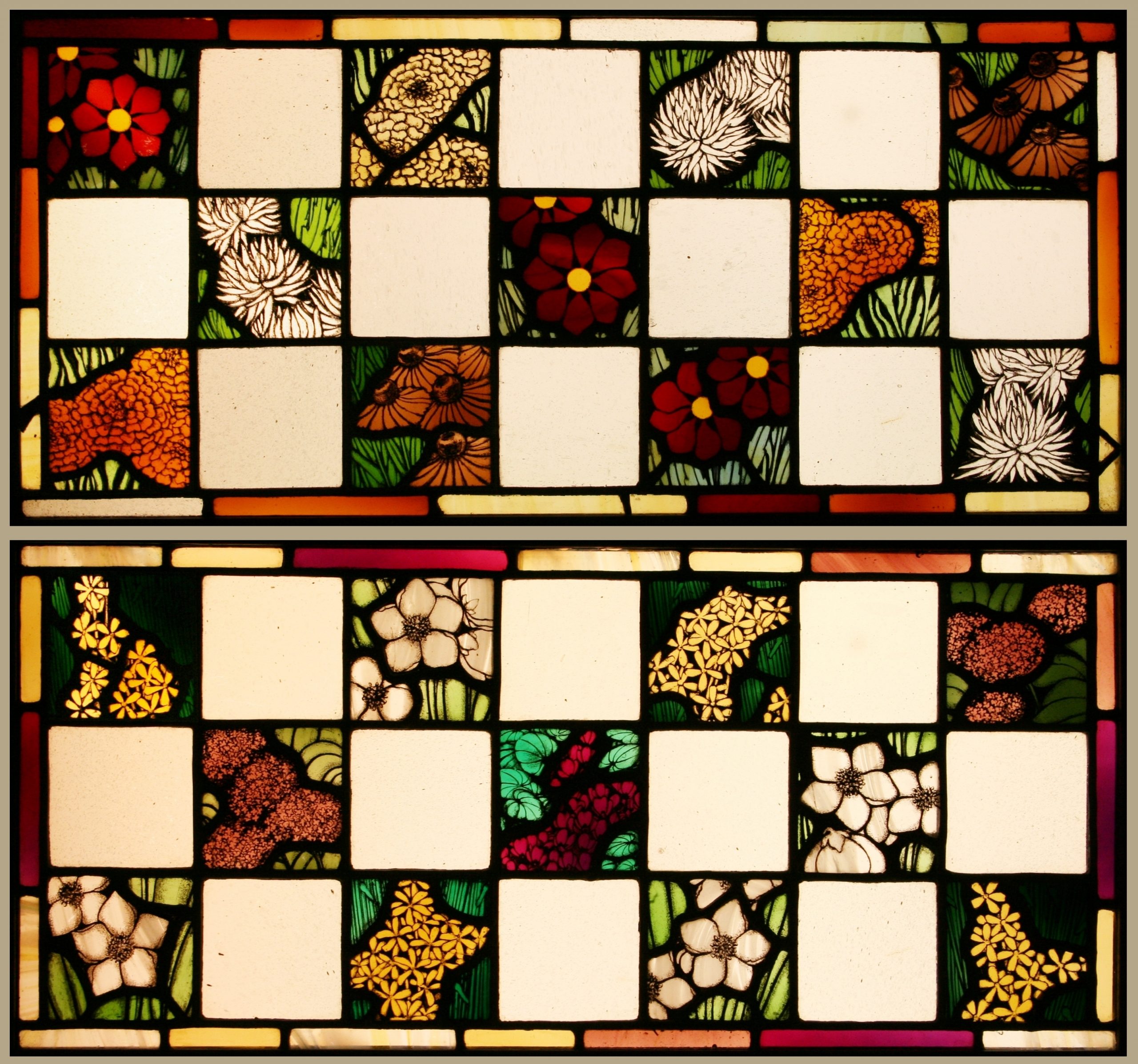 Set of four stained glass transom windows, each depicting a season of Flowers.