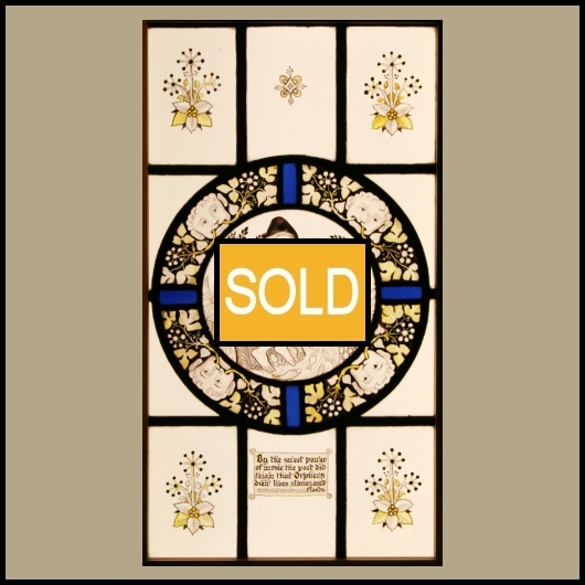 Stained glass window leaded with clear “Antique” hand blown glass, a large central roundel depicting a boy with a flute by a stream, around are stylised green man motifs, several leaves and berries and a verse from Shakespeare’s The Merchant of Venice play. “by the sweet power of music did feign that Orpheus view lies stores and floods”