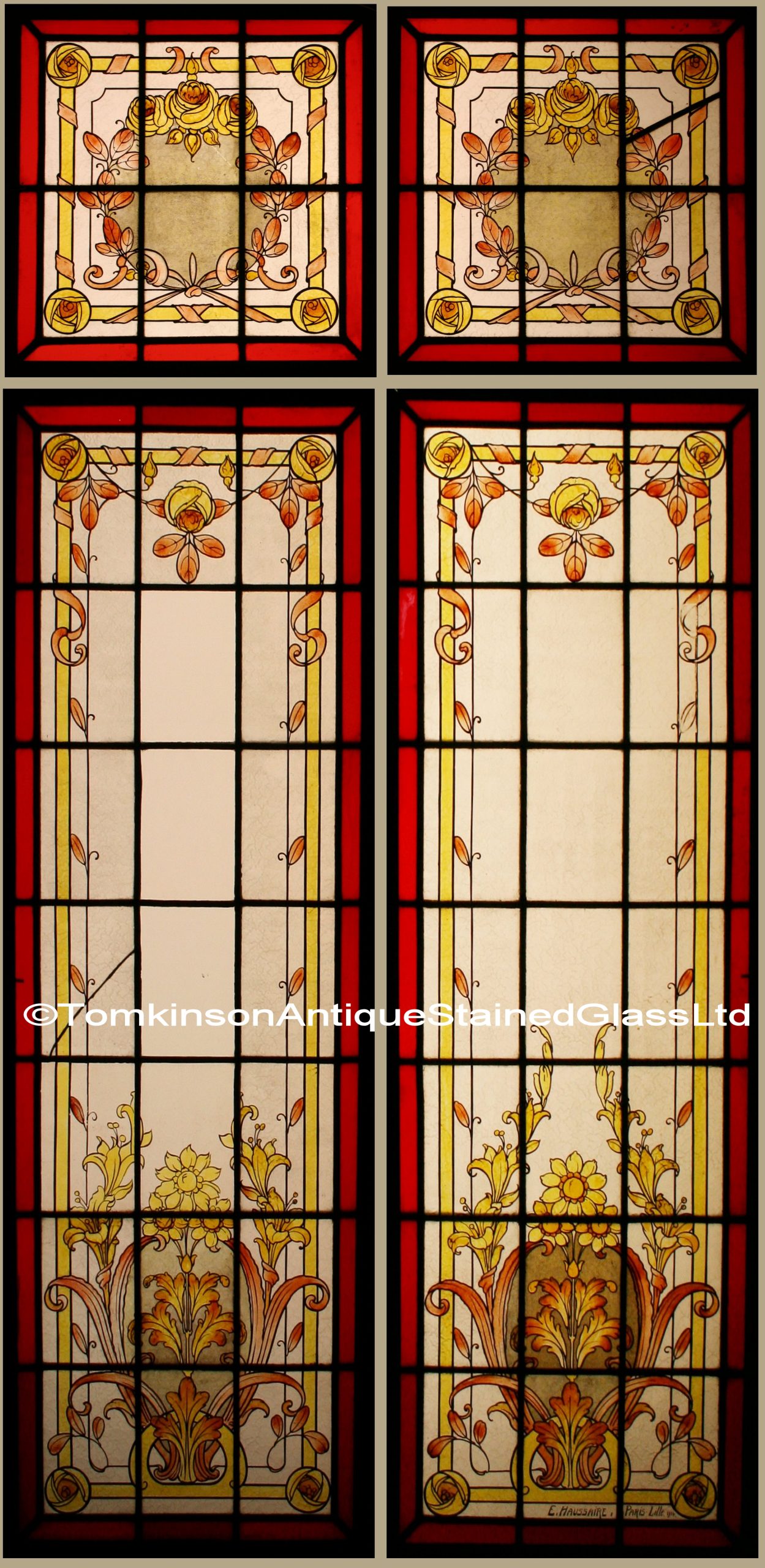 Tags: art nouveau, Château Windows, coloured glass, French Doors, French stained glass, French windows, Hand painted, Hand painted window, Leaded glass, Leaded window, Pair, Stained glass, Tomkinson Stained Glass Ltd