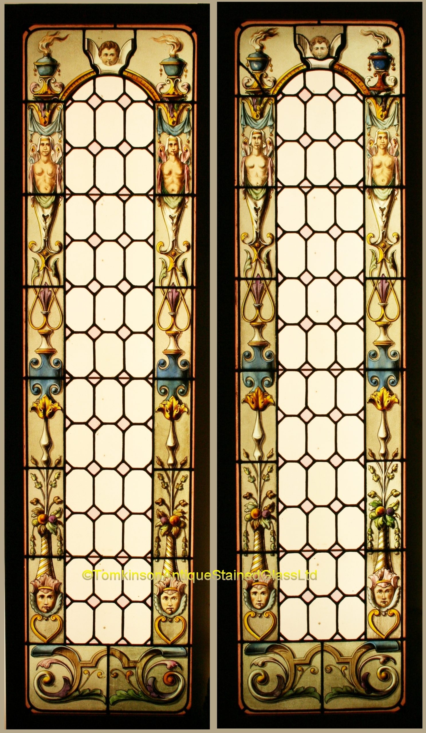 Pair of antique french stained glass windows c1900, hand painted with enamel paints depicting caryatids, putti heads, masks, foliage, fruits and flowers. In the center is clear leaded glass and pastel pink coloured pink diamonds. In excellent original condition and in pine frames for shipping/handling purposes.