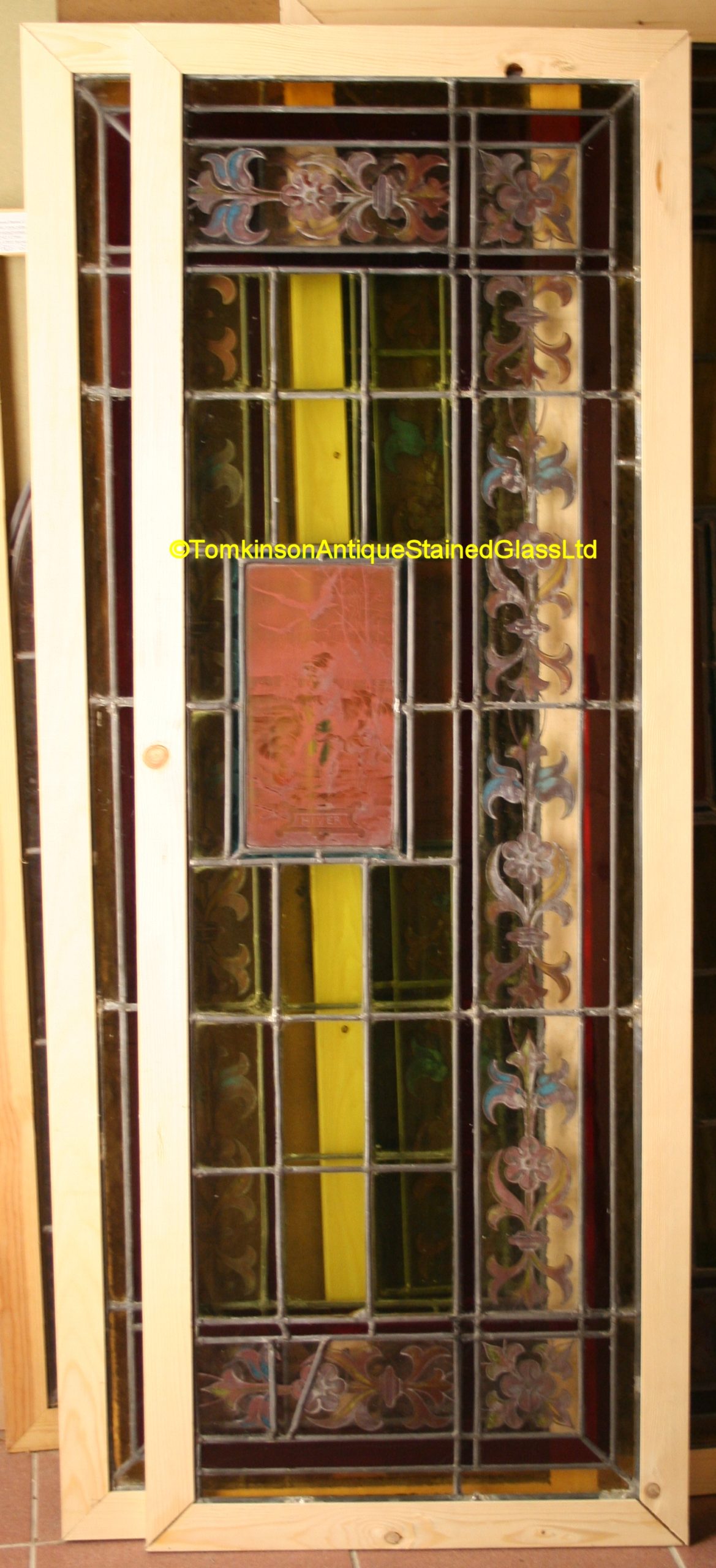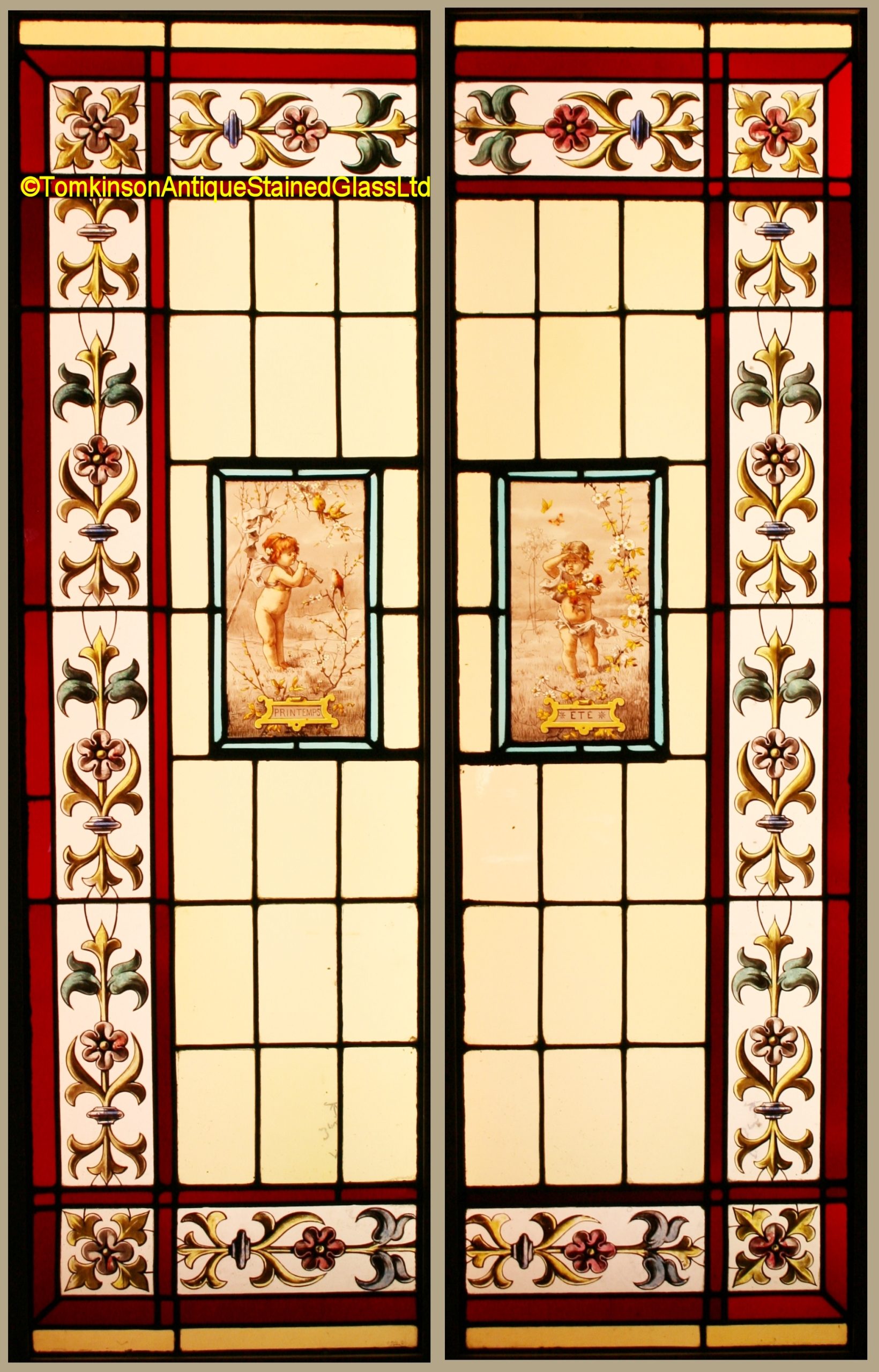 Pair of decorative french stained glass windows, c1910, leaded with a mixture of obscure and clear coloured glass with central panels hand painted depicting Spring – Printemps and Summer – Ete. Around is a decorative stylised flower and foliage border painted with enamel paints. Both windows in excellent condition.