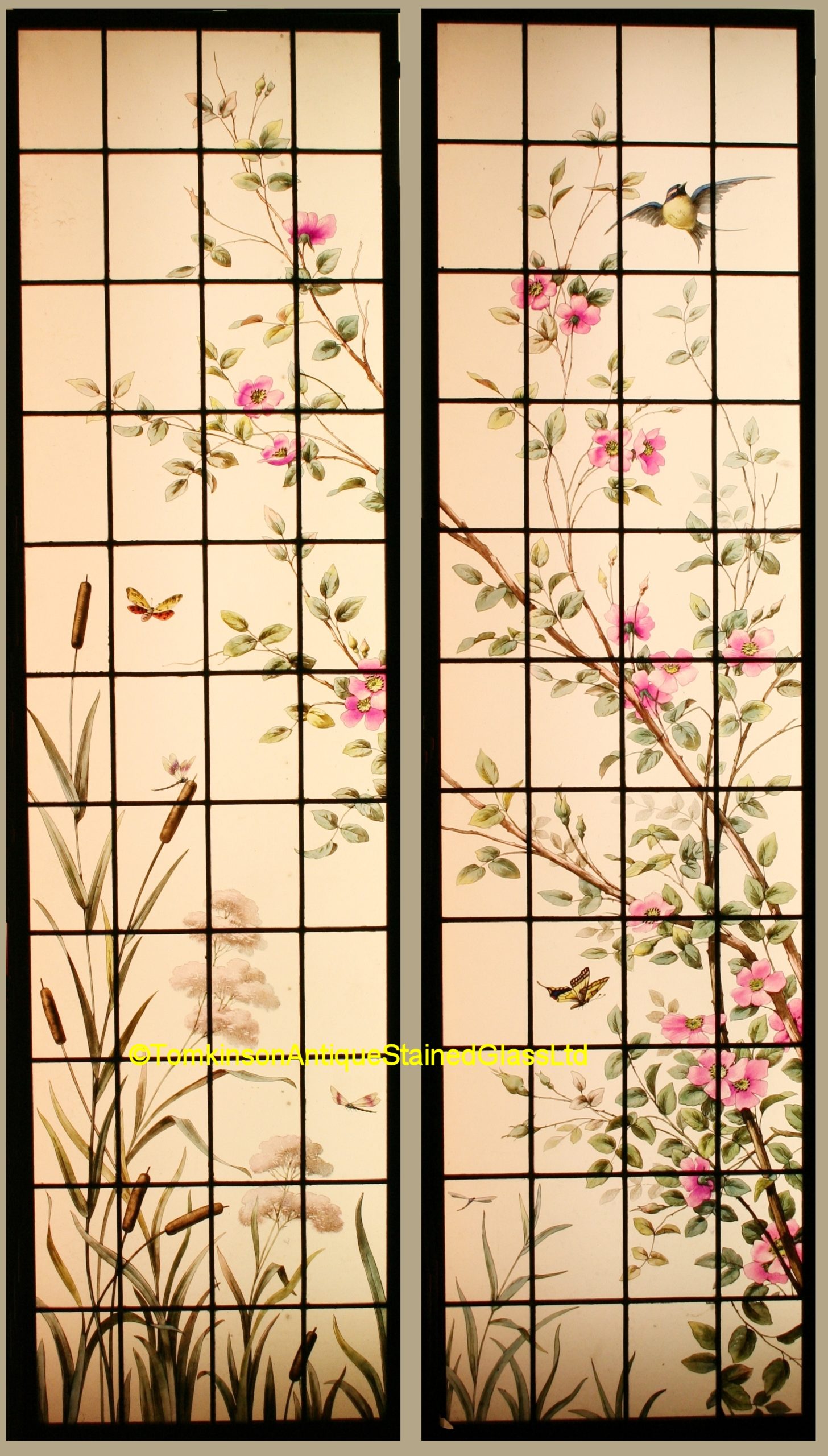 Pair of antique french stained glass windows, each leaded with obscure glass and hand painted depicting branches of Pink briar roses, Bulrush reeds, Birds, Butterflies, Dragonflies, various other flowers and foliage. Super quality and both windows are in excellent condition.