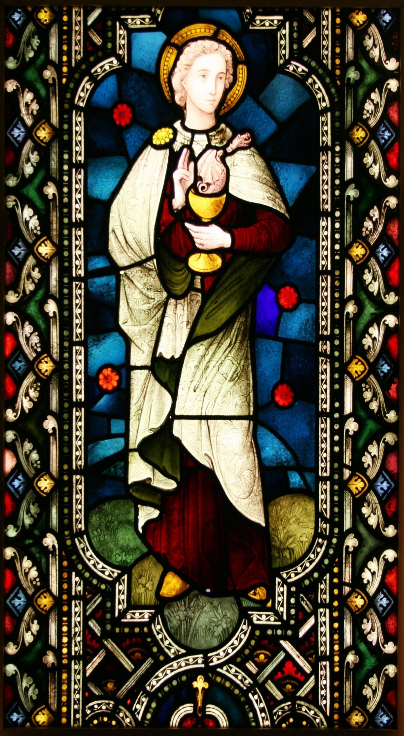 Antique stained glass church window by Lavers, Barraud and Westlake (1855 – 1921) London, who were part of the Gothic Revival movement that influenced English church architecture in the 19th century. Leaded and hand painted depicting the full length figure St John holding a Chalice. Excellent quality, no fading and in excellent condition.