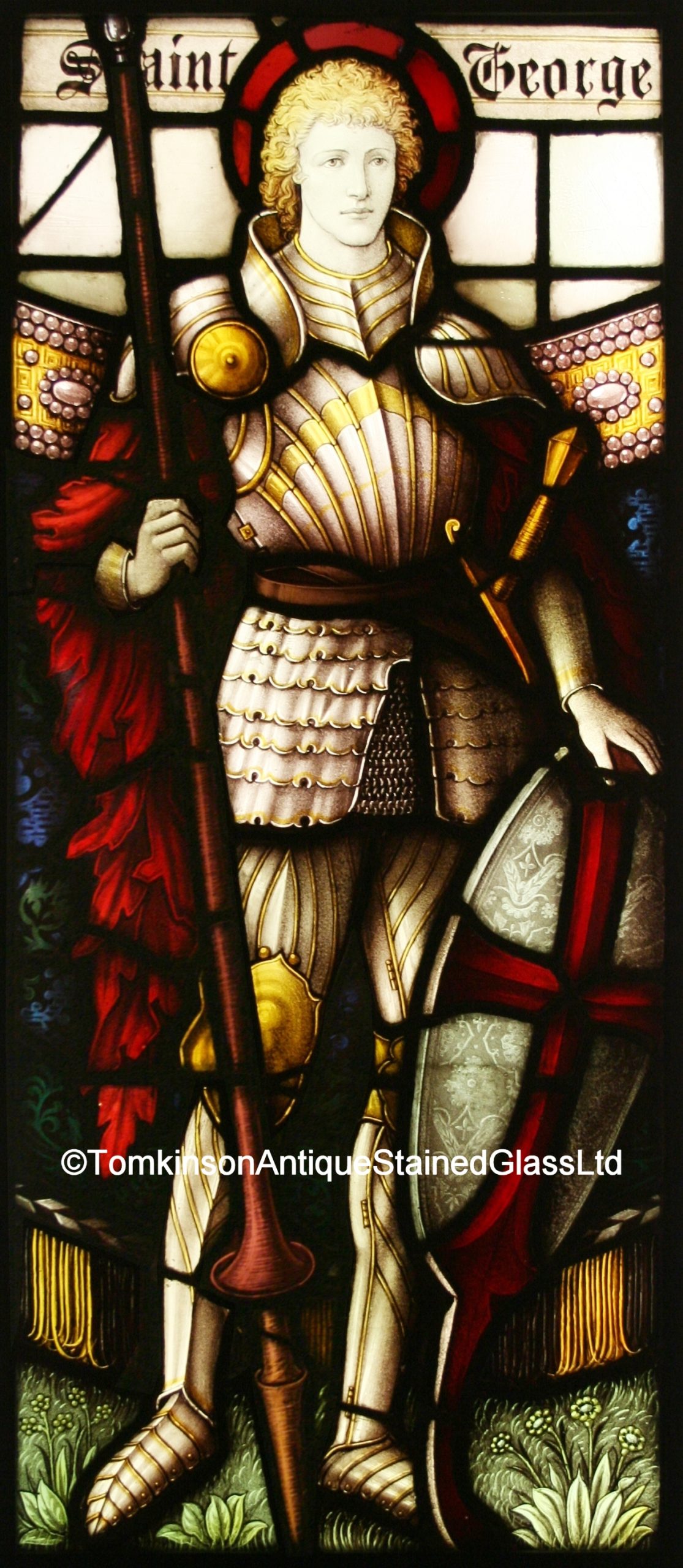 Large antique Victorian stained glass window, hand painted depicting St George, super quality and with lead and glass in original excellent condition.
