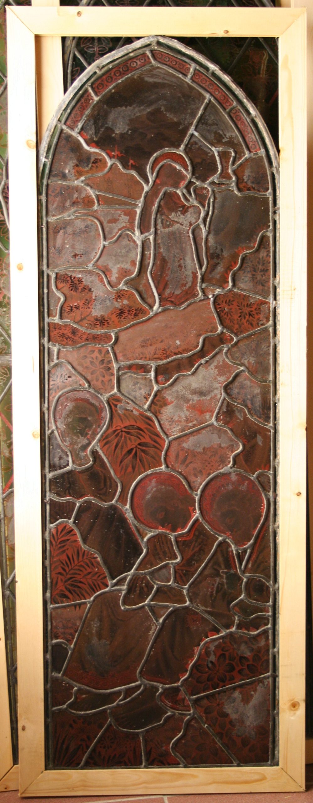 Antique Victorian Gothic Revival stained glass window c1898, hand painted depicting JC praying in the garden of Gethsemane while his disciples sleep. Super quality and in excellent original condition.