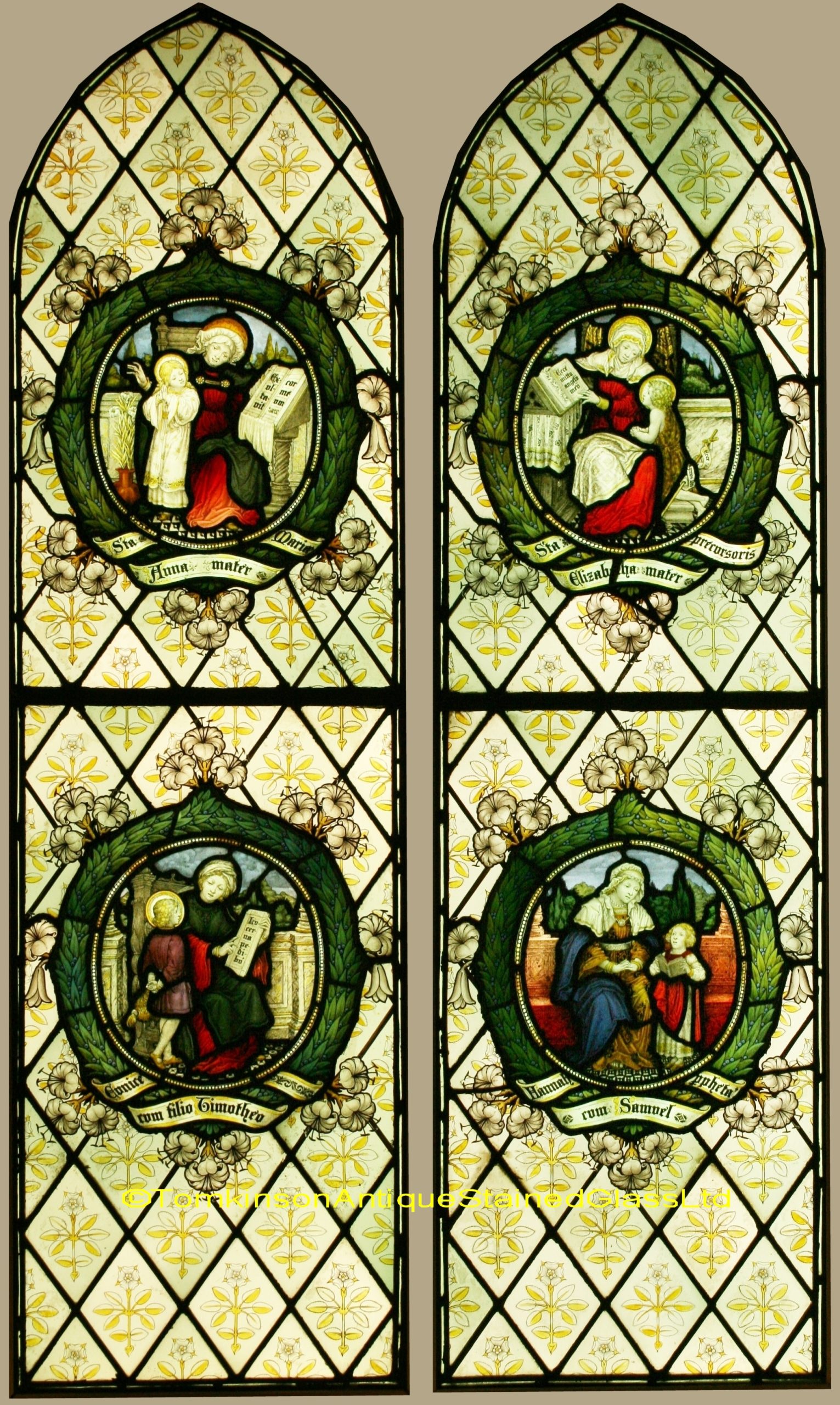 2 Antique Victorian Gothic Revival stained glass windows c1904, each lancet window is leaded with central hand painted roundels depicting biblical scenes of various saints. Around each is a laurel wreath and Lilly flowers, with stylised quarries. Super quality and in excellent original condition.