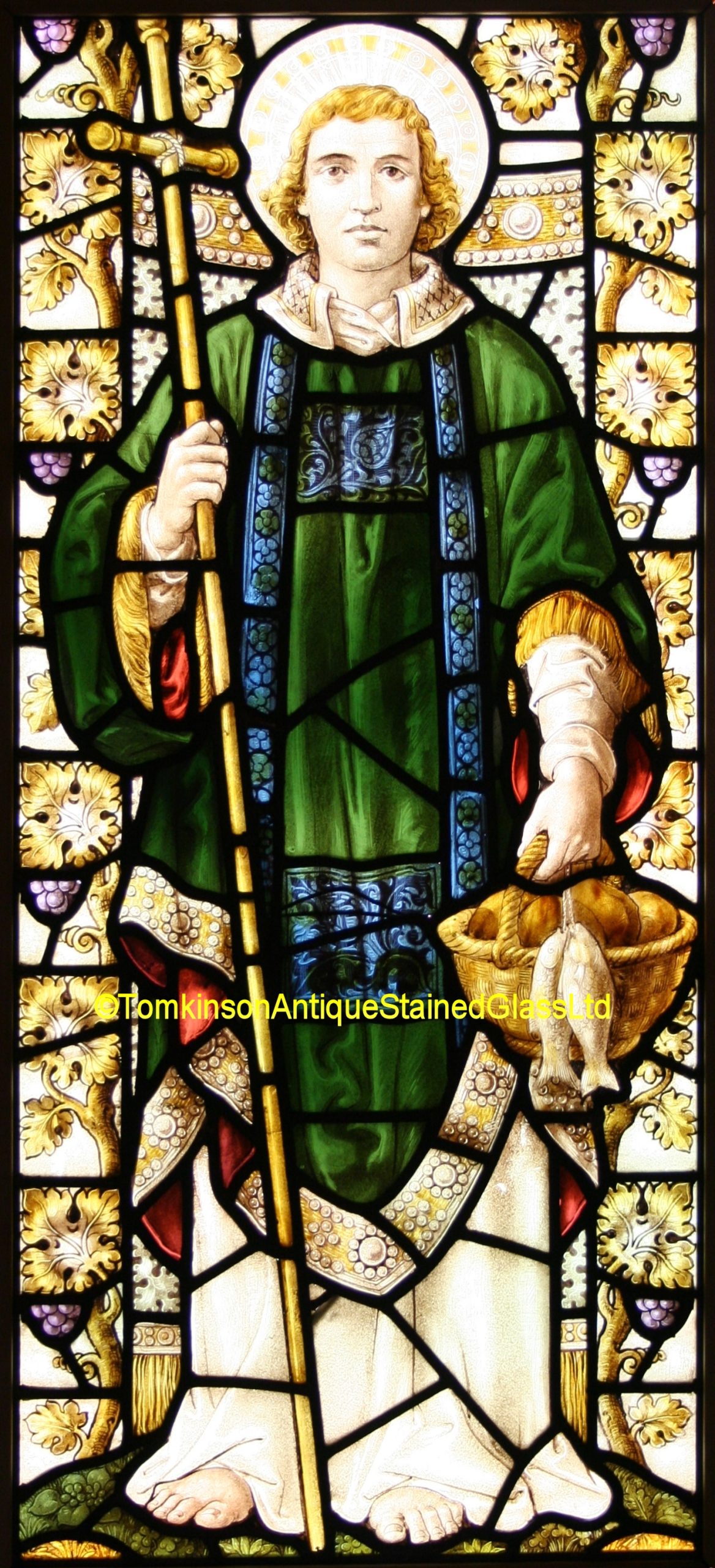 Antique church stained glass window, c1900, hand painted depicting a male saint, believed to be St Philip the Apostle, holding a staff/cross, fishes and a basket of bread, wearing a vivid emerald robe the best quality “Antique” glass had been used. Around is a grape and vine border.