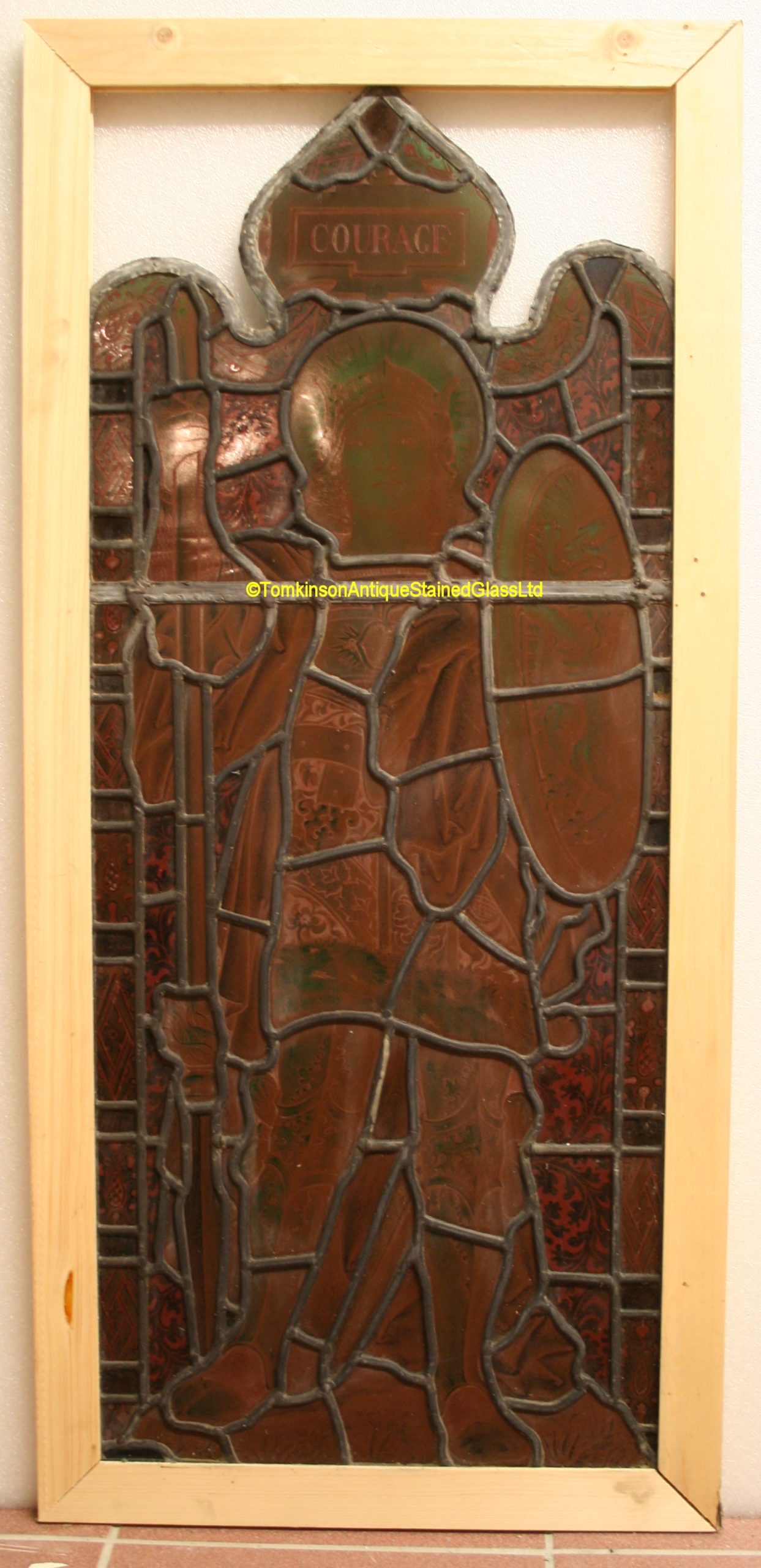 Two antique Victorian stained glass windows, each leaded with coloured glass hand painted depicting Saints. Left window is Courage, a soldier in erumin robes holding a shield with the image of a rampant lion and a spear. Right window depicts Victory, a soldier in armour holding a sword and a Laurel wreath. Lovely window, super quality and with lead and glass in excellent condition.