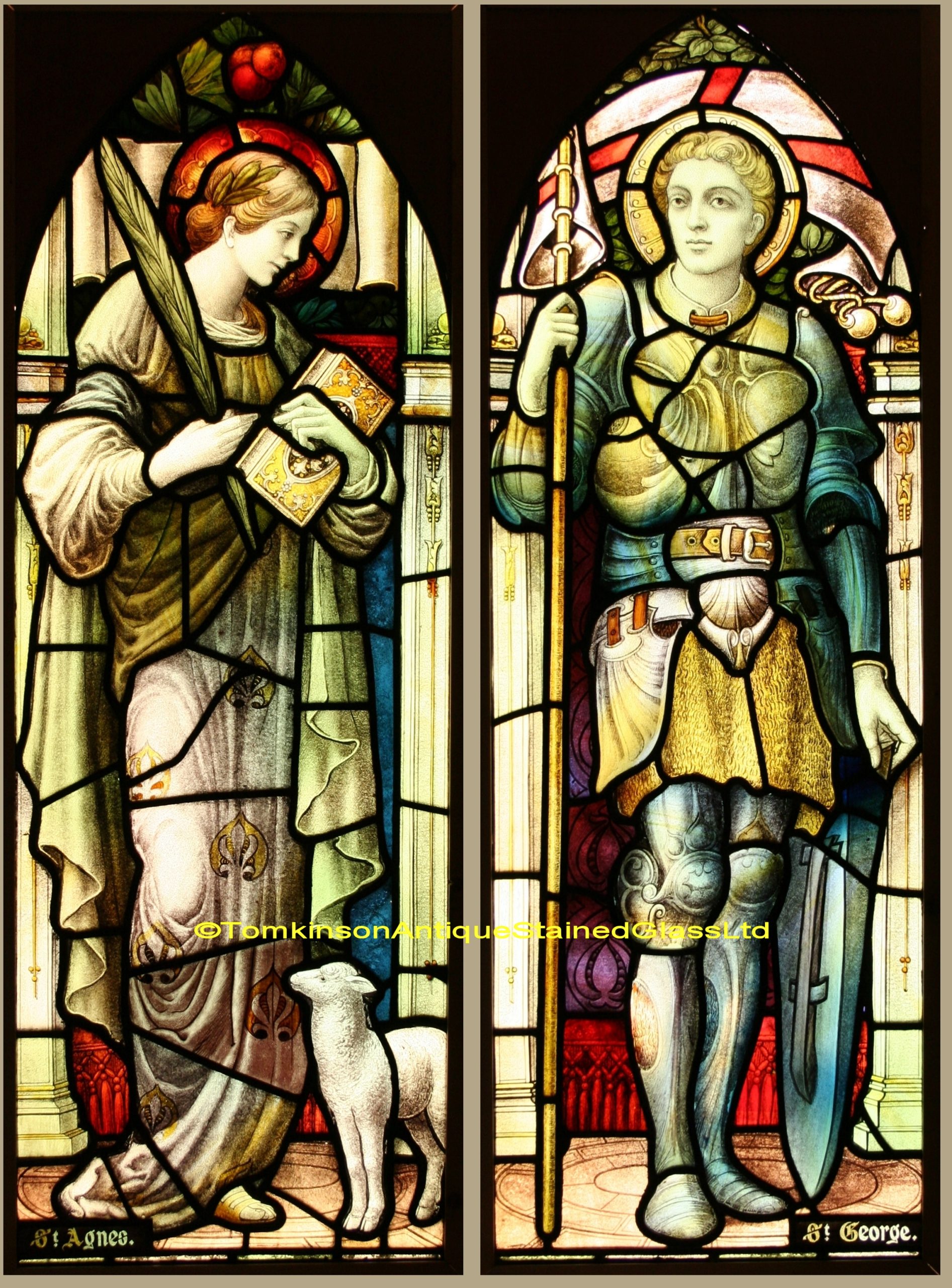 Ref: Rel347 – 2 Antique Religious Church Stained Glass Windows – St Agnes & St George