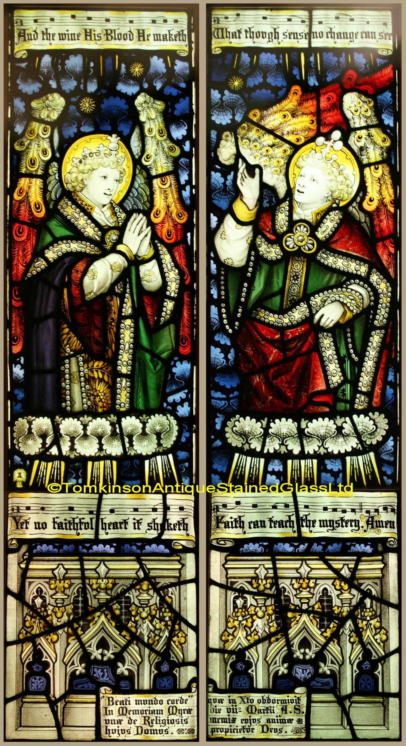 Pair of Gothic Revival church windows each leaded with hand painted stained glass depicting angels with peacock feather wings and richly decorative robes. The lower panels are of architectural tracery, each with inscriptions.