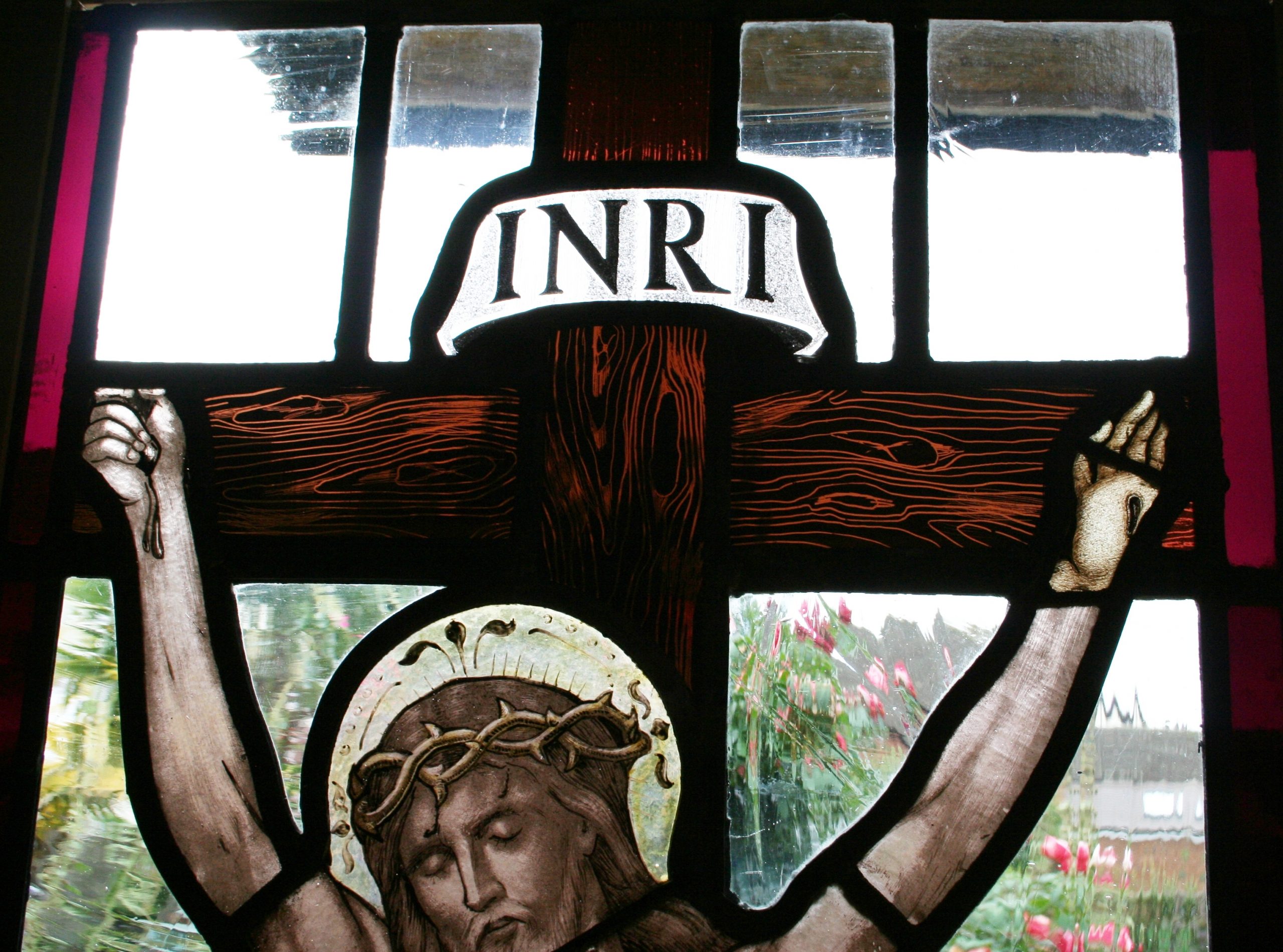 Ref: Rel385 – Antique Stained Glass Window – Christ on the Cross