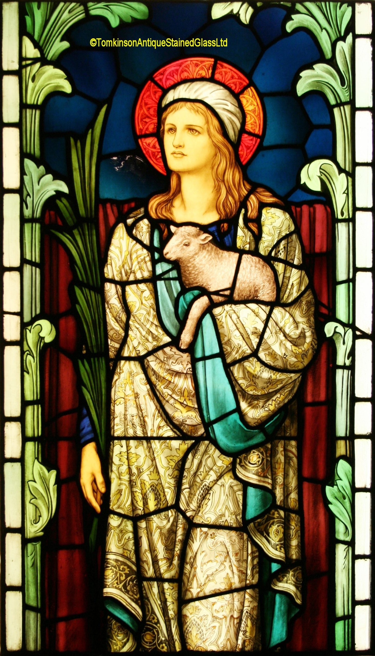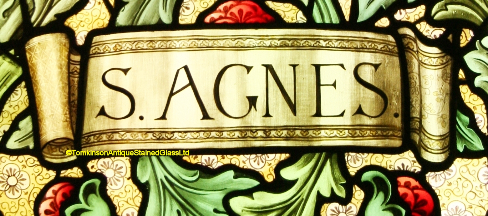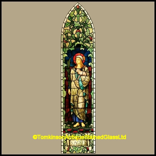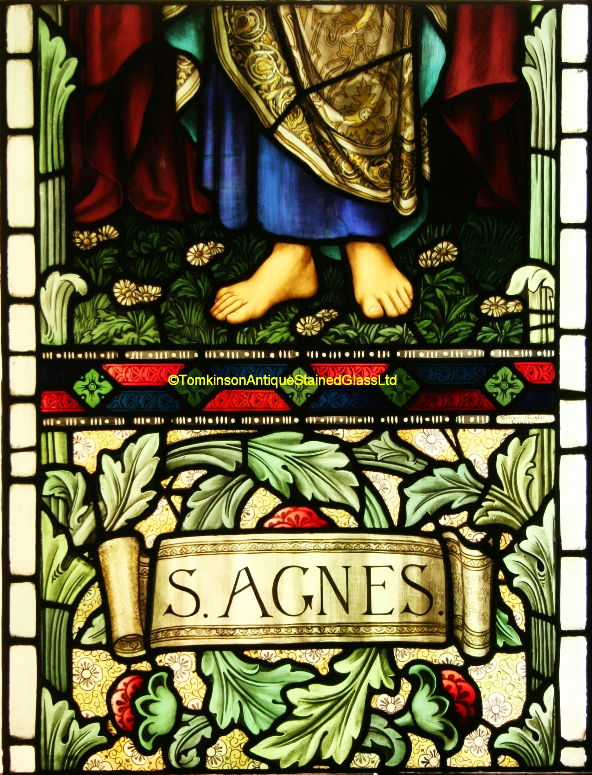 Church stained glass window with lancet arched top, hand painted depicting flowers and foliage, middle section is the figure of St Agnes holding a lamb and a martyr’s palm, the lower panel having the St Agnes inscription and the Glasby signature. Super quality and in excellent condition, the window is in 2 sections.