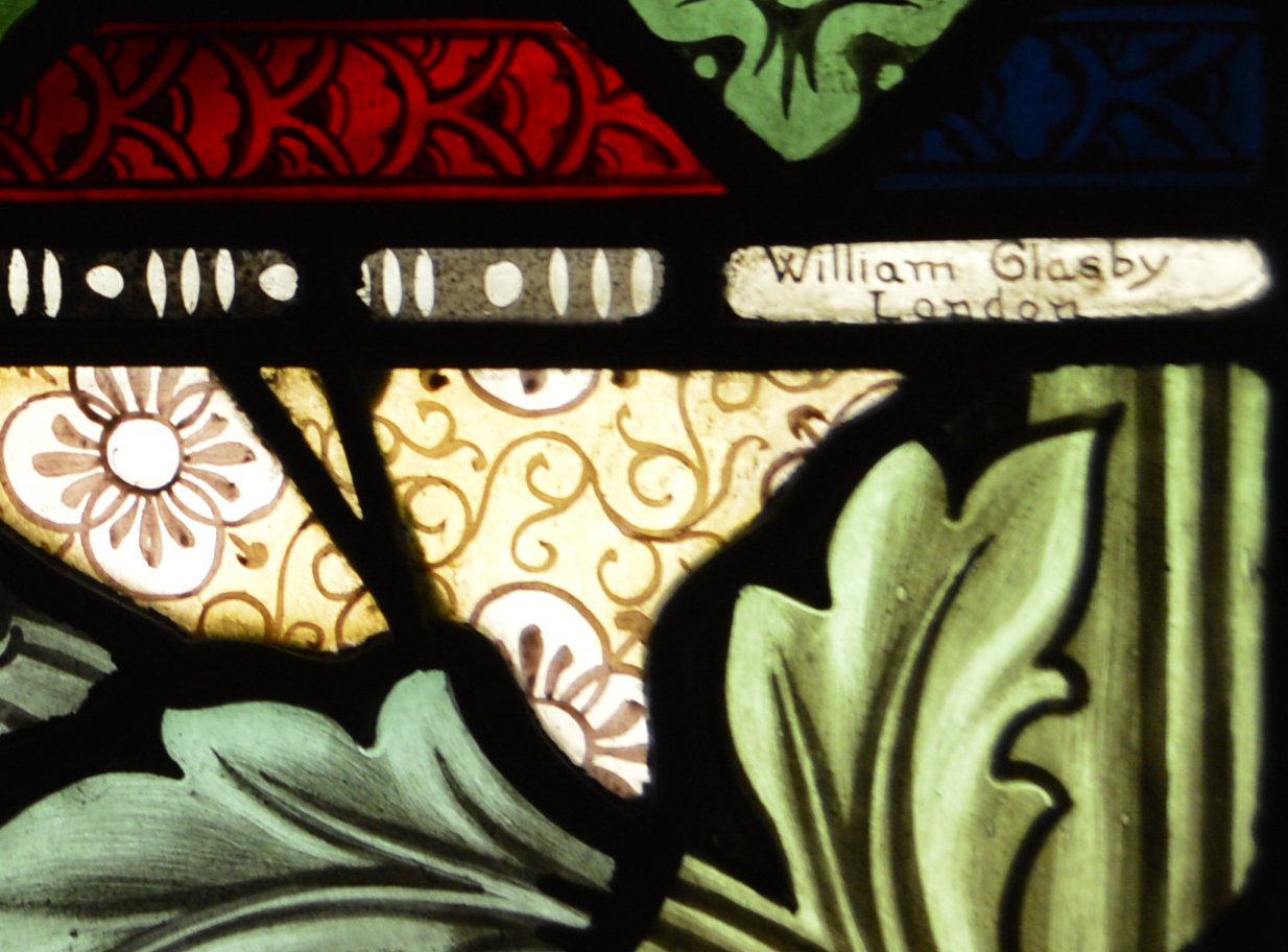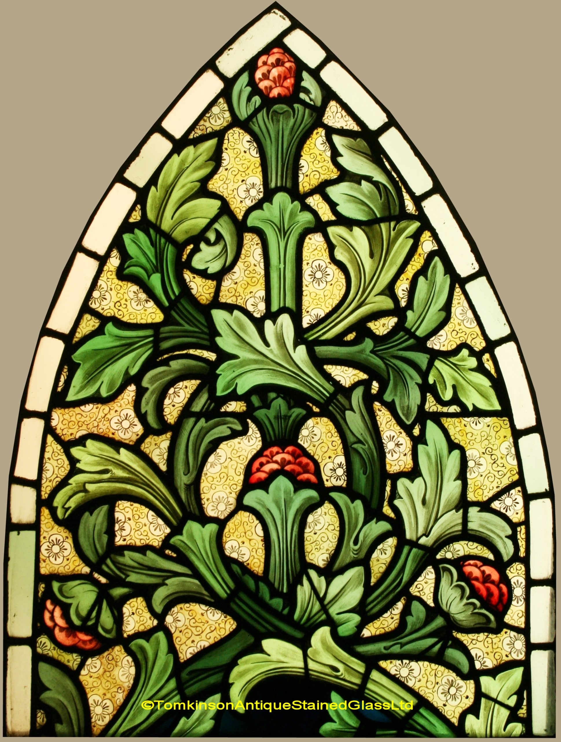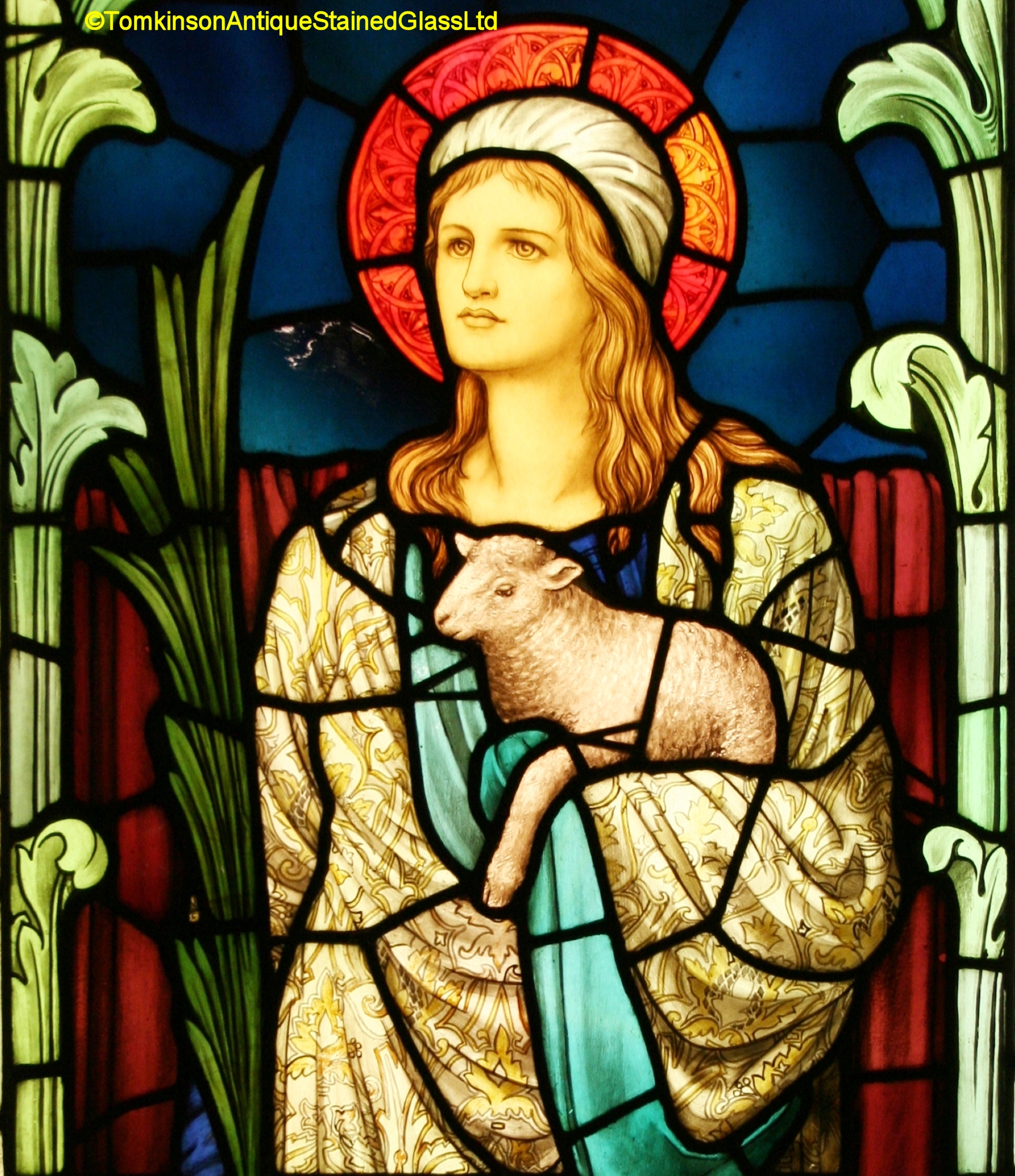 Church stained glass window with lancet arched top, hand painted depicting flowers and foliage, middle section is the figure of St Agnes holding a lamb and a martyr’s palm, the lower panel having the St Agnes inscription and the Glasby signature. Super quality and in excellent condition, the window is in 2 sections.