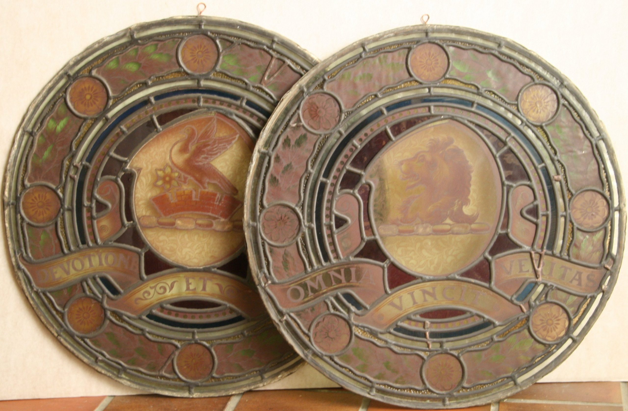 Two antique 19th century armorial stained glass panels, each leaded with hand painted central shields, motto scrolls and laurel & flower border. Lovely decorative panels in excellent condition and with copper wire hanging hooks attached so can be hung at a window.