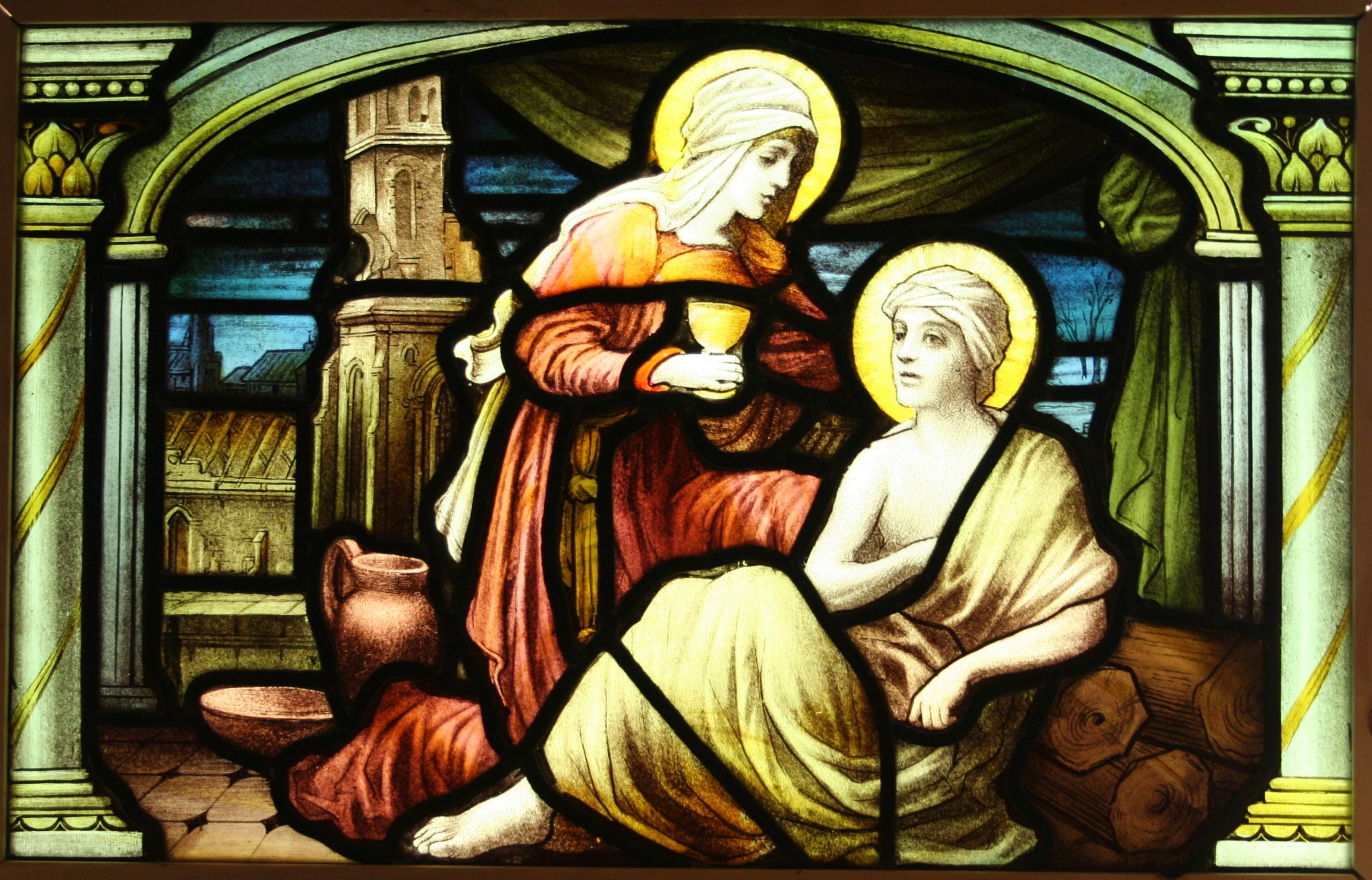 Panel 1: Depicts Virgin Mary giving food and drink to a man.