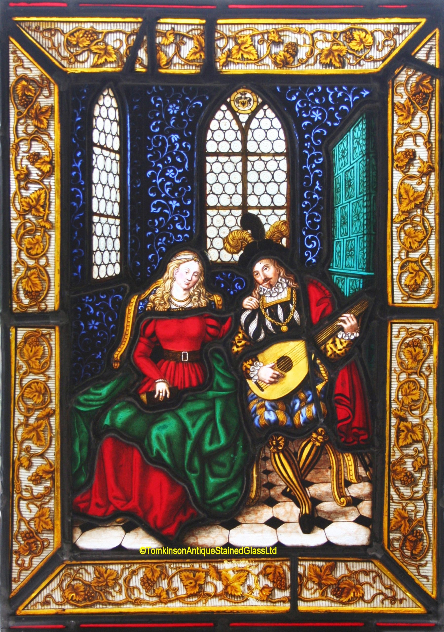 Antique German stained glass panel hand painted depicting a man serenading a lady. Super quality of painting and with a grape and vine border. Slight restoration which has kept the panel in original condition.