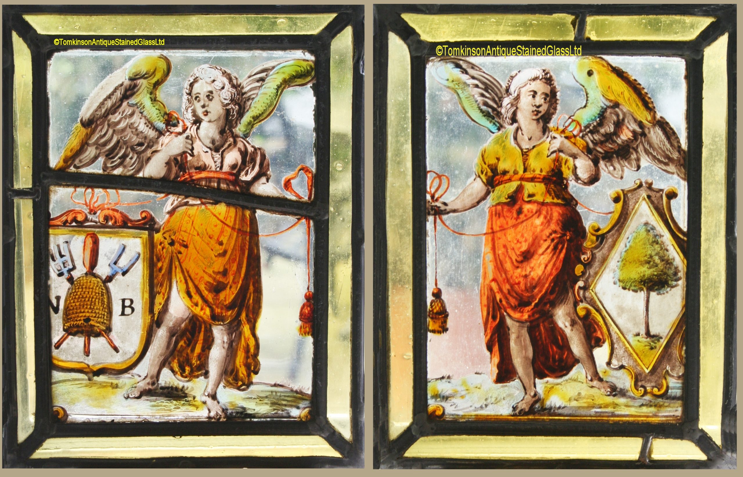 Two original 16th century Flemish leaded and hand painted stained glass panels depicting Angels holding shields of Merchant Marks.