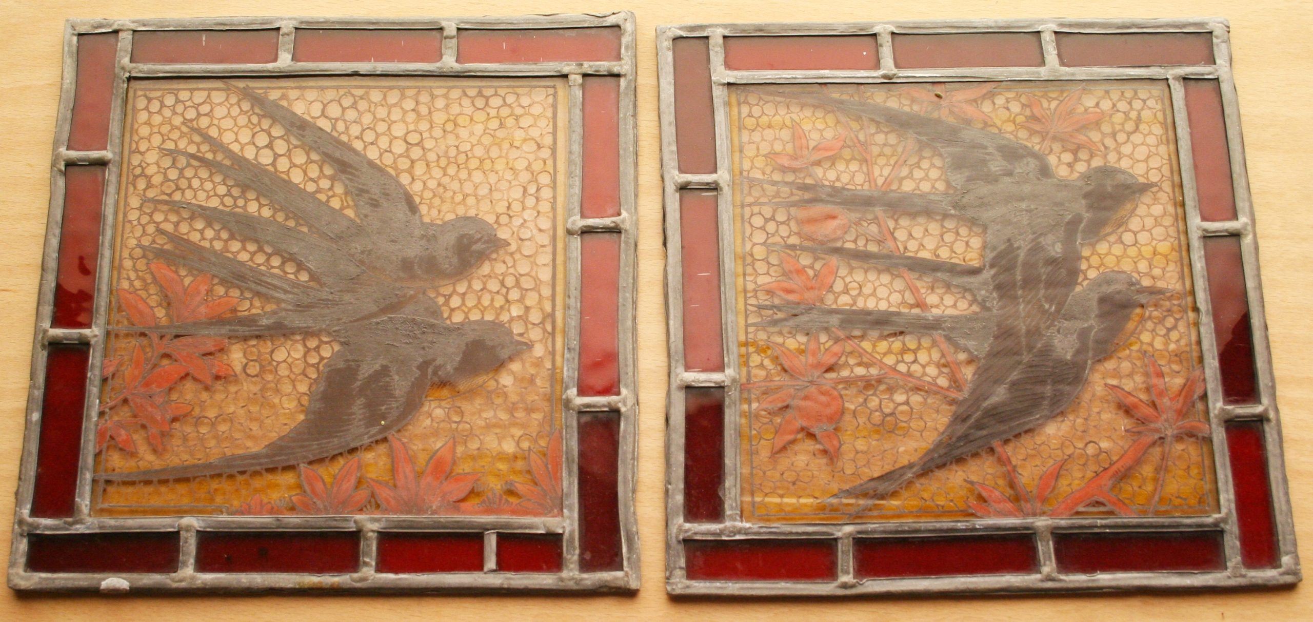 2 Decorative aesthetic movement/arts & crafts antique stained glass panels, each hand painted depicting Swifts flying over branches of berries and foliage, both in excellent condition.