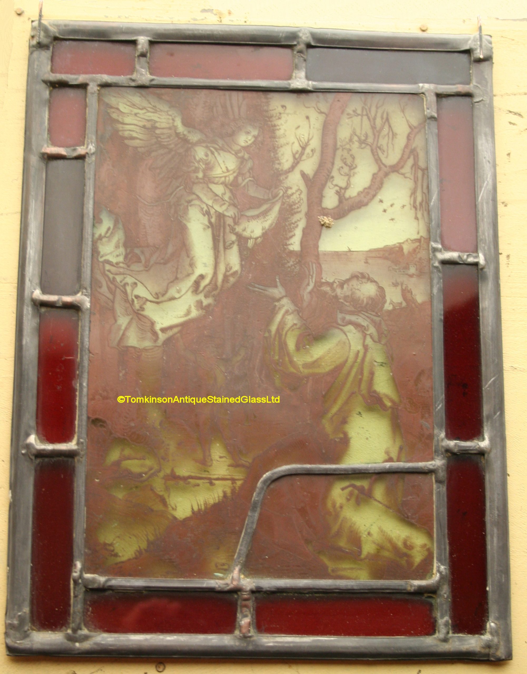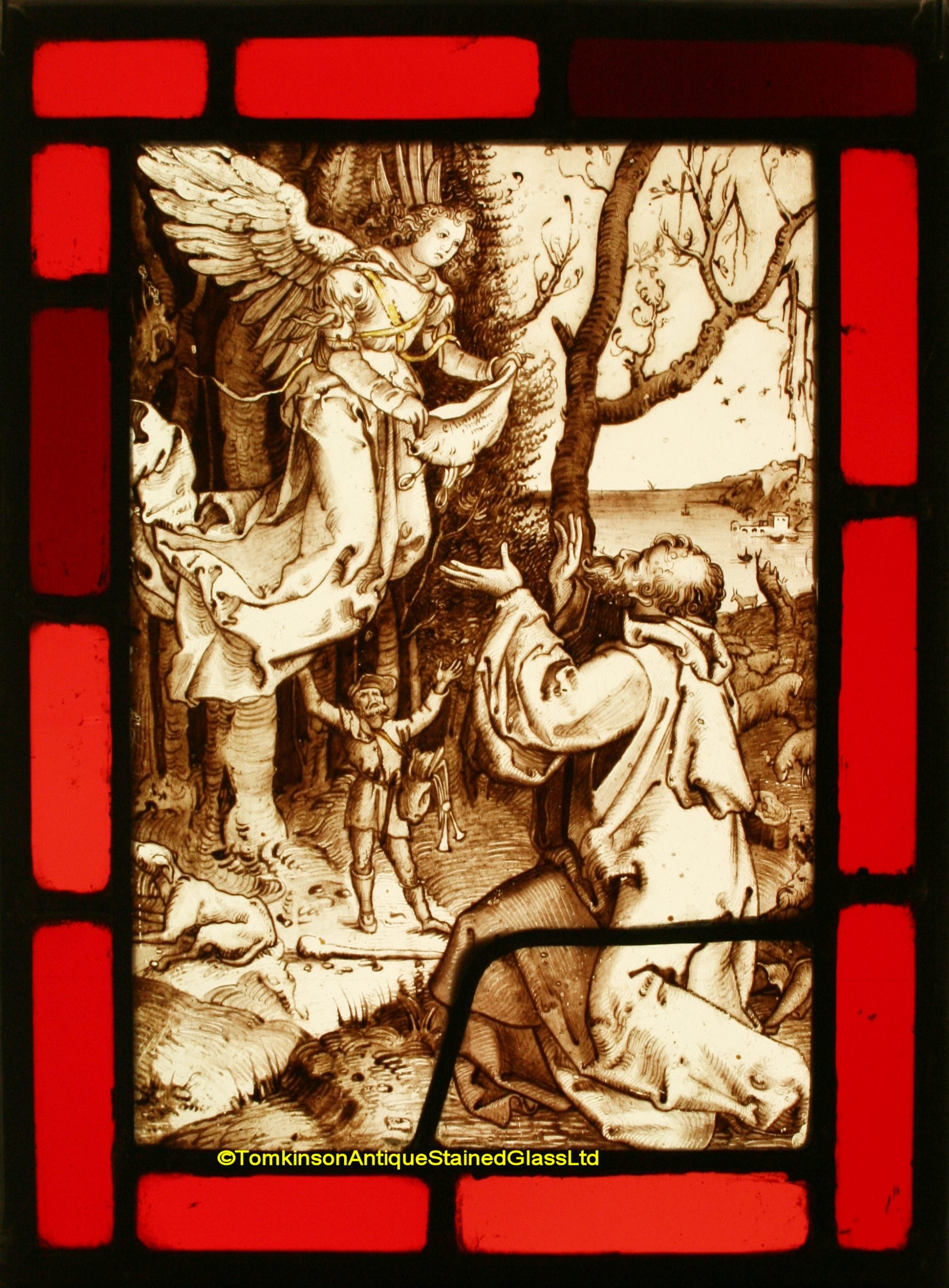 Antique stained glass panel, hand painted depicting Joachim and the Angel, after a woodcut by Albrecht Dürer. Hanging loops are attached.
