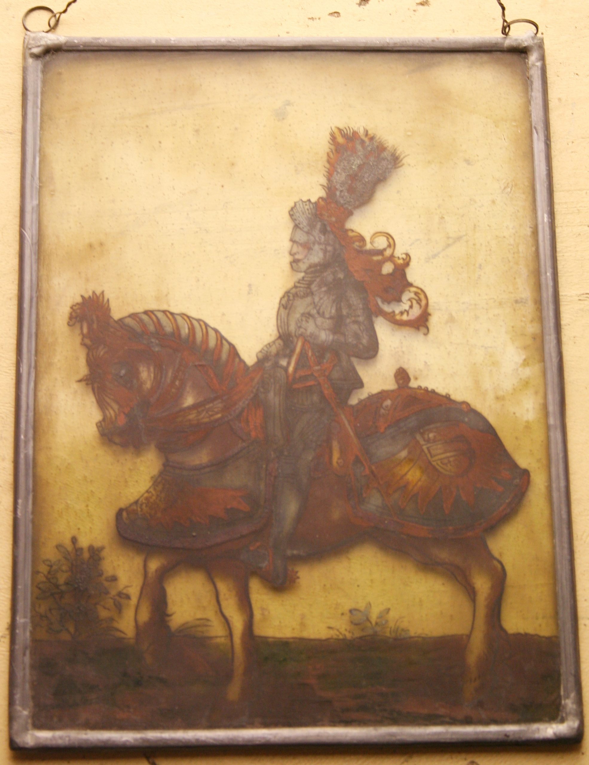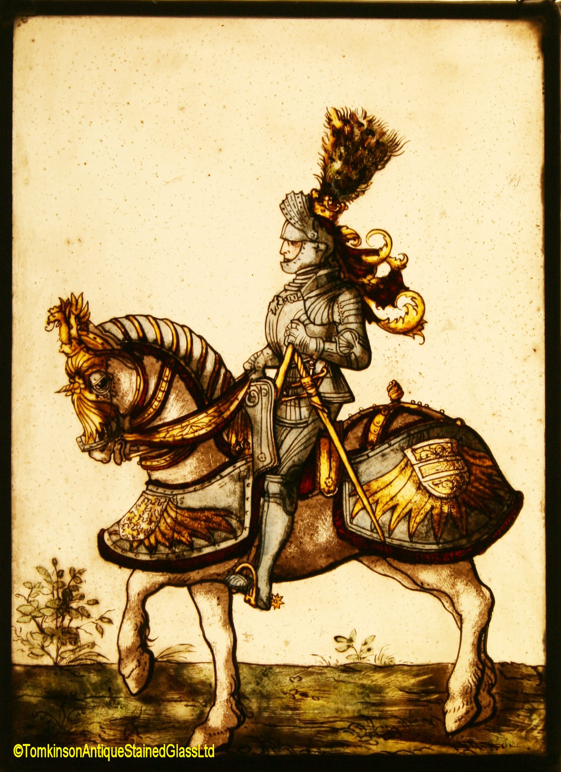 Antique stained glass panel, hand painted depicting a mounted Knight and his horse in full parade armour. 19th century, painted in 16th century style. In excellent condition and with hanging loop attached.
