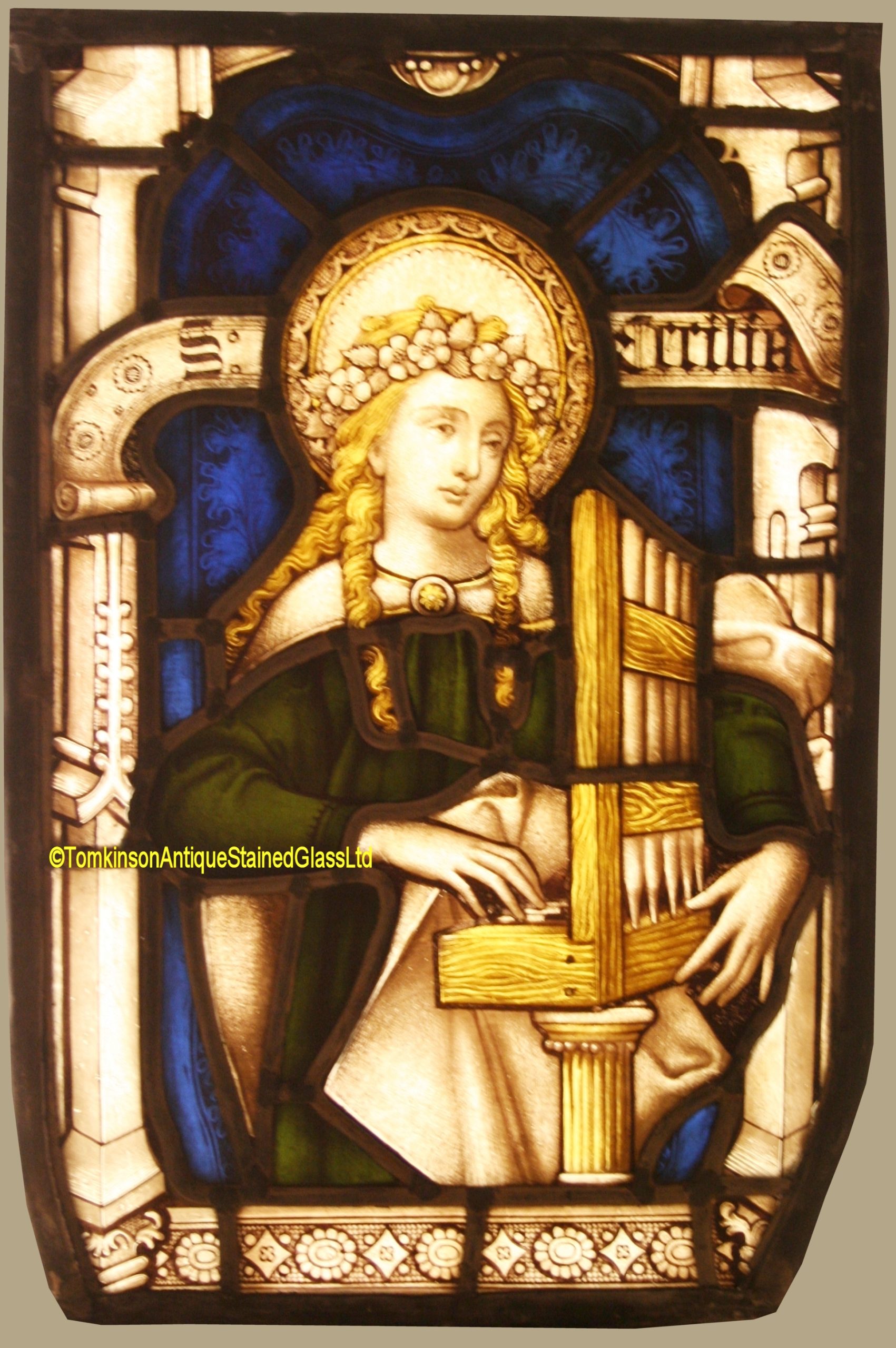 Antique stained glass panel leaded with hand painted coloured glass depicting St Cecilia patron saint of music and musicians, she is seen holding and playing an organ. Lovely decorative panel and in excellent condition.