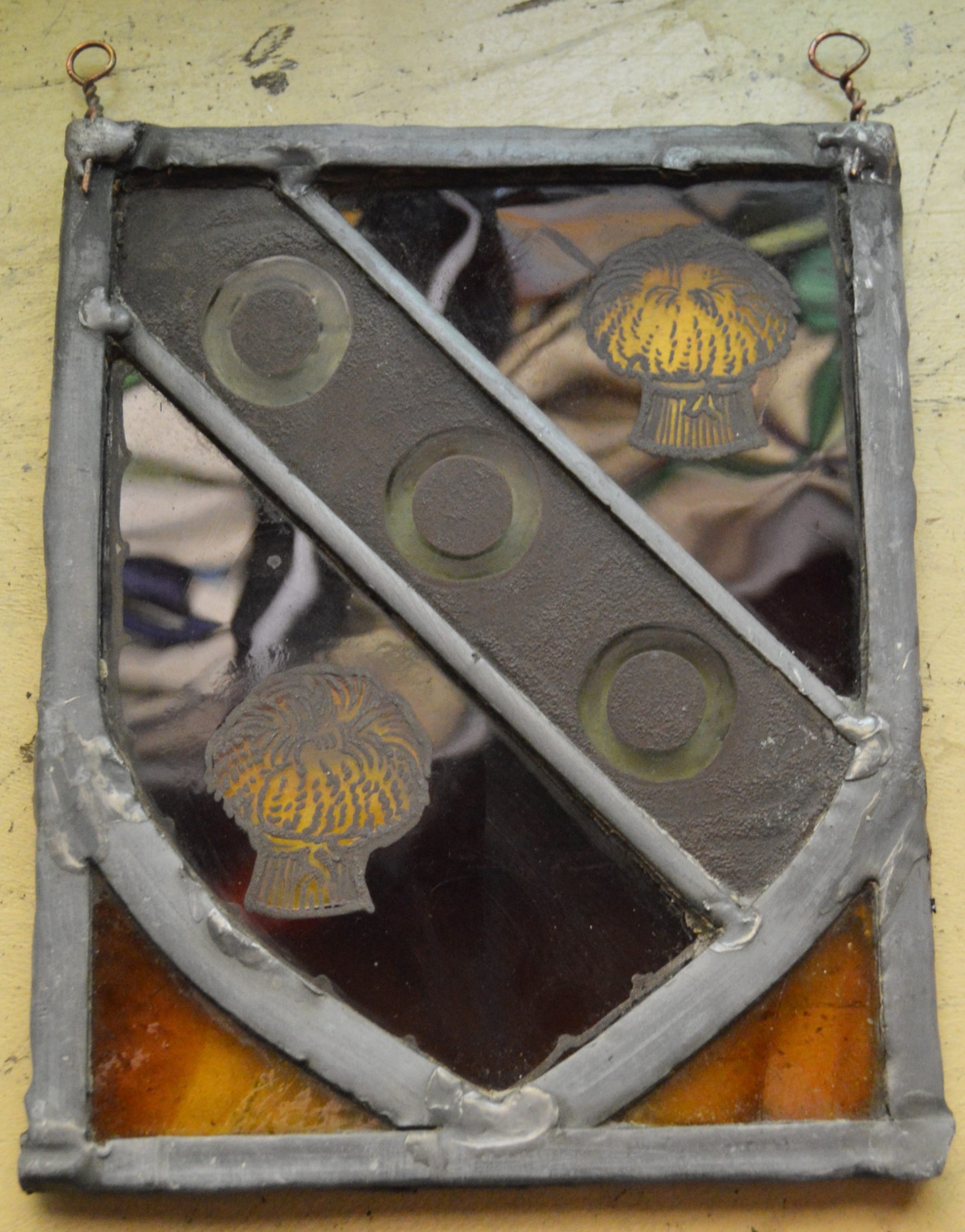 Four antique panels leaded with acid etched glass and hand painted depicting coats of arms, each salvaged from larger windows and now made into window hangers. In good condition and with hanging hooks attached.