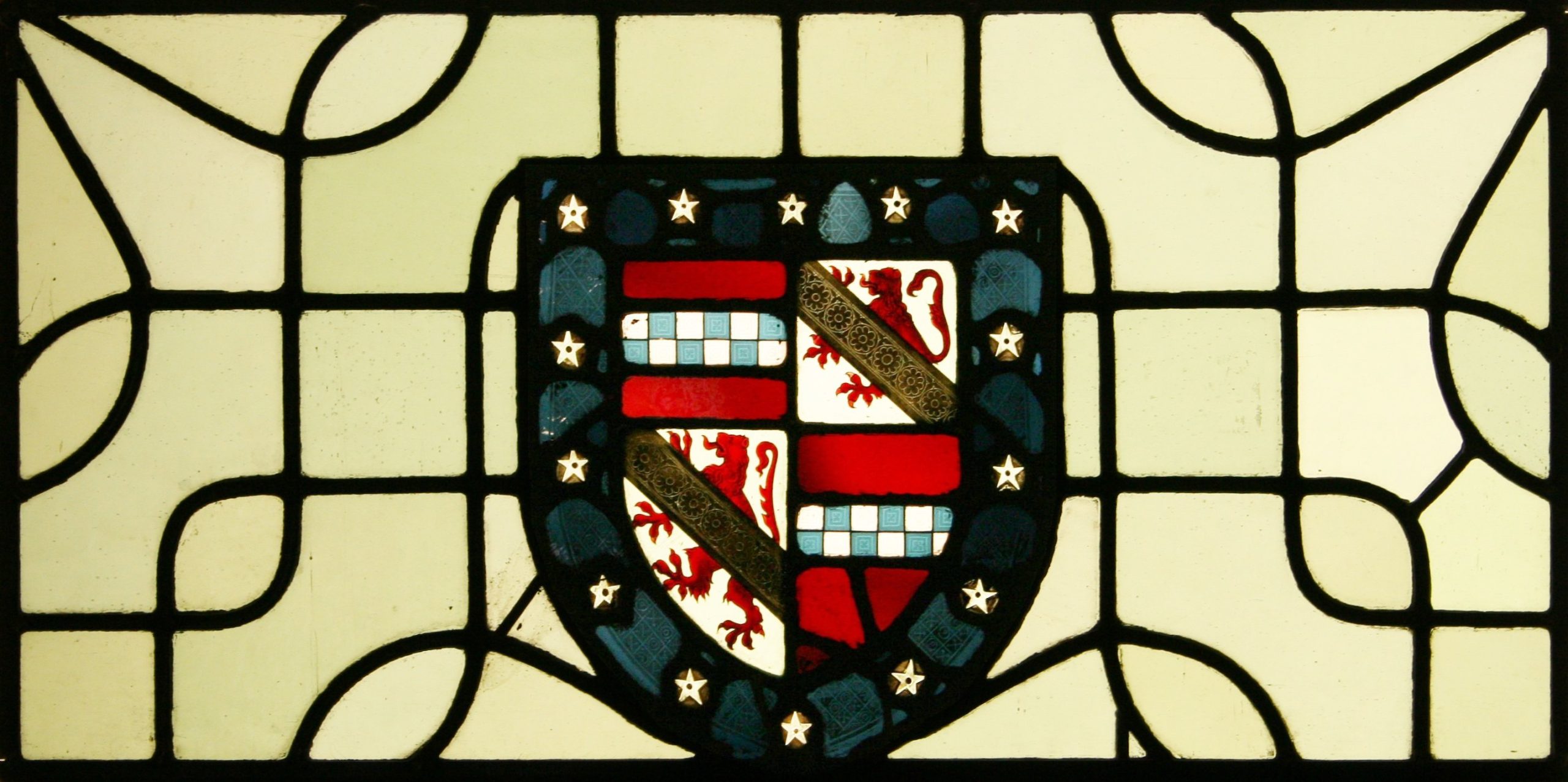 Two horizontal leaded stained glass windows each with central hand painted shields depicting Coats of Arms, around is pastel green obscure coloured glass. Both in excellent condition. Can be sold separately.