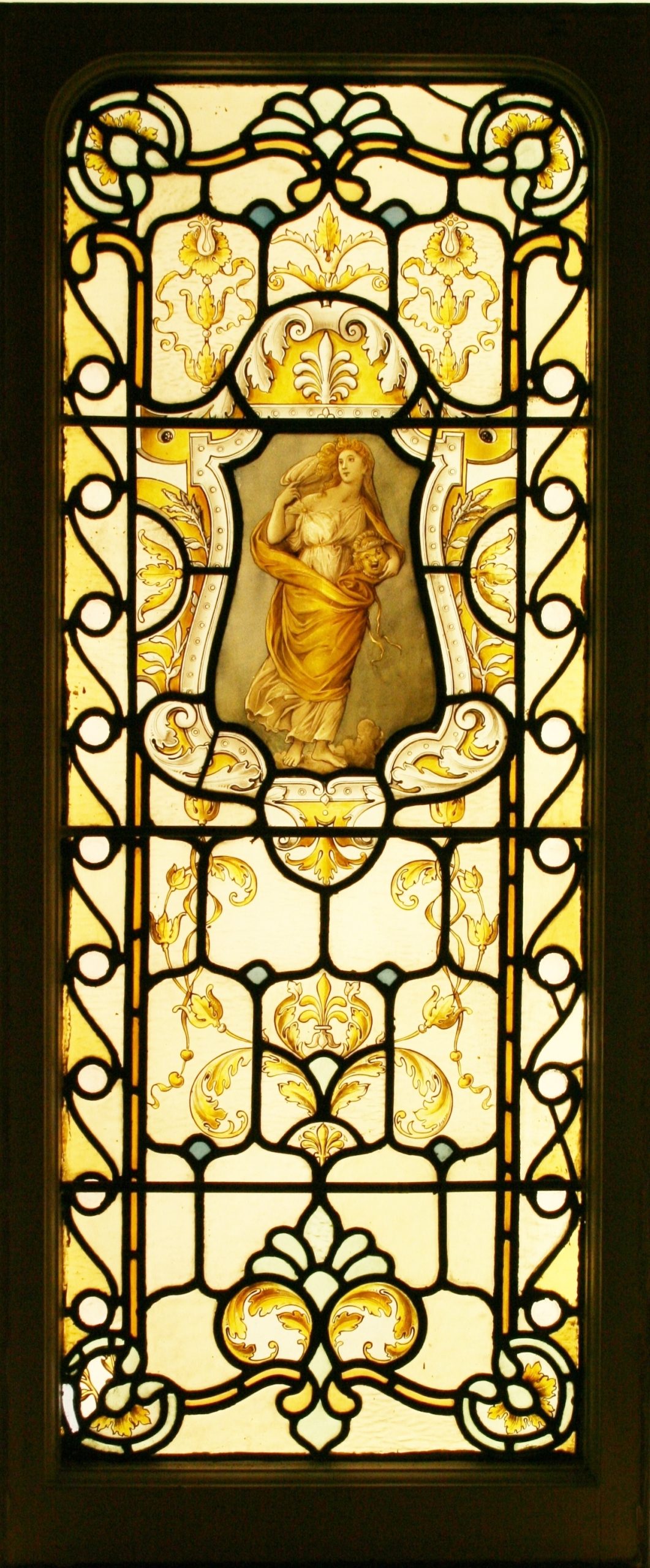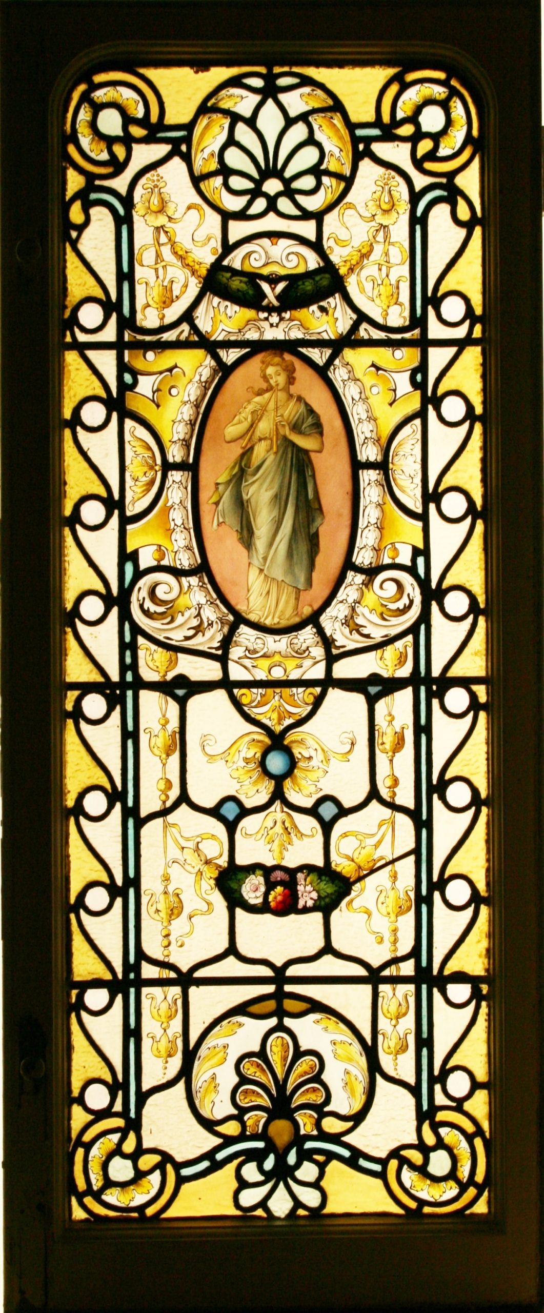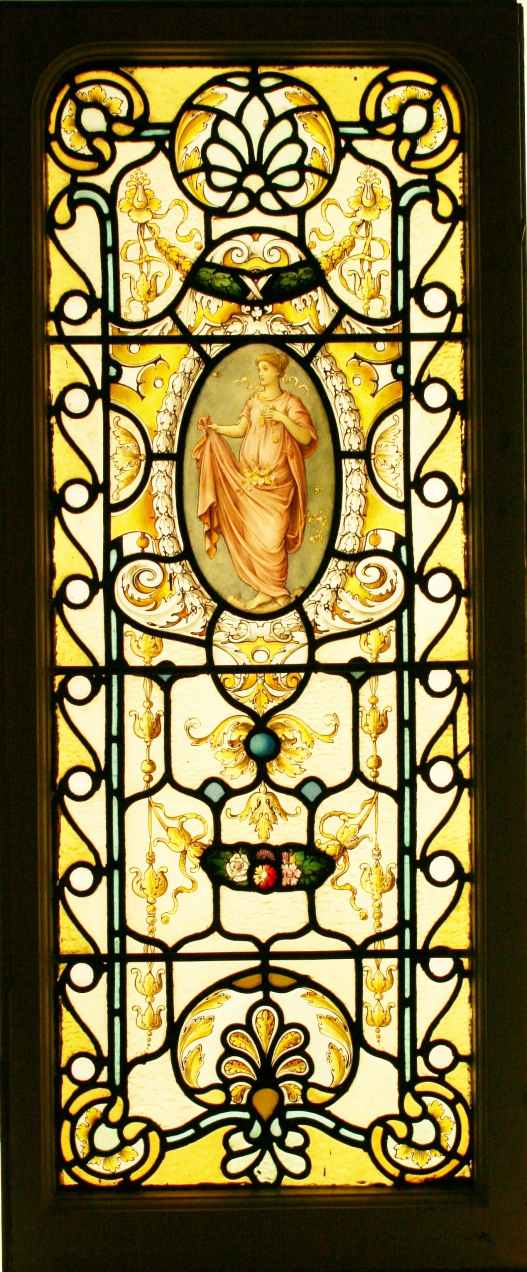 Large and impressive set of stained glass windows comprising of 4 transom tops and 4 lower windows. Each are leaded with a mixture obscure plain and pastel yellow coloured glass and hand painted depicting Roman & Greek female classical figures around are garlands of flowers, swirls of Acanthus leaves. Painted with enamel and silver stain paints and restored with slight lead strap restoration. Sold as individual windows but we also have the original pine frame from which they were removed. Ideal for a conservatory, sunroom or orangery.