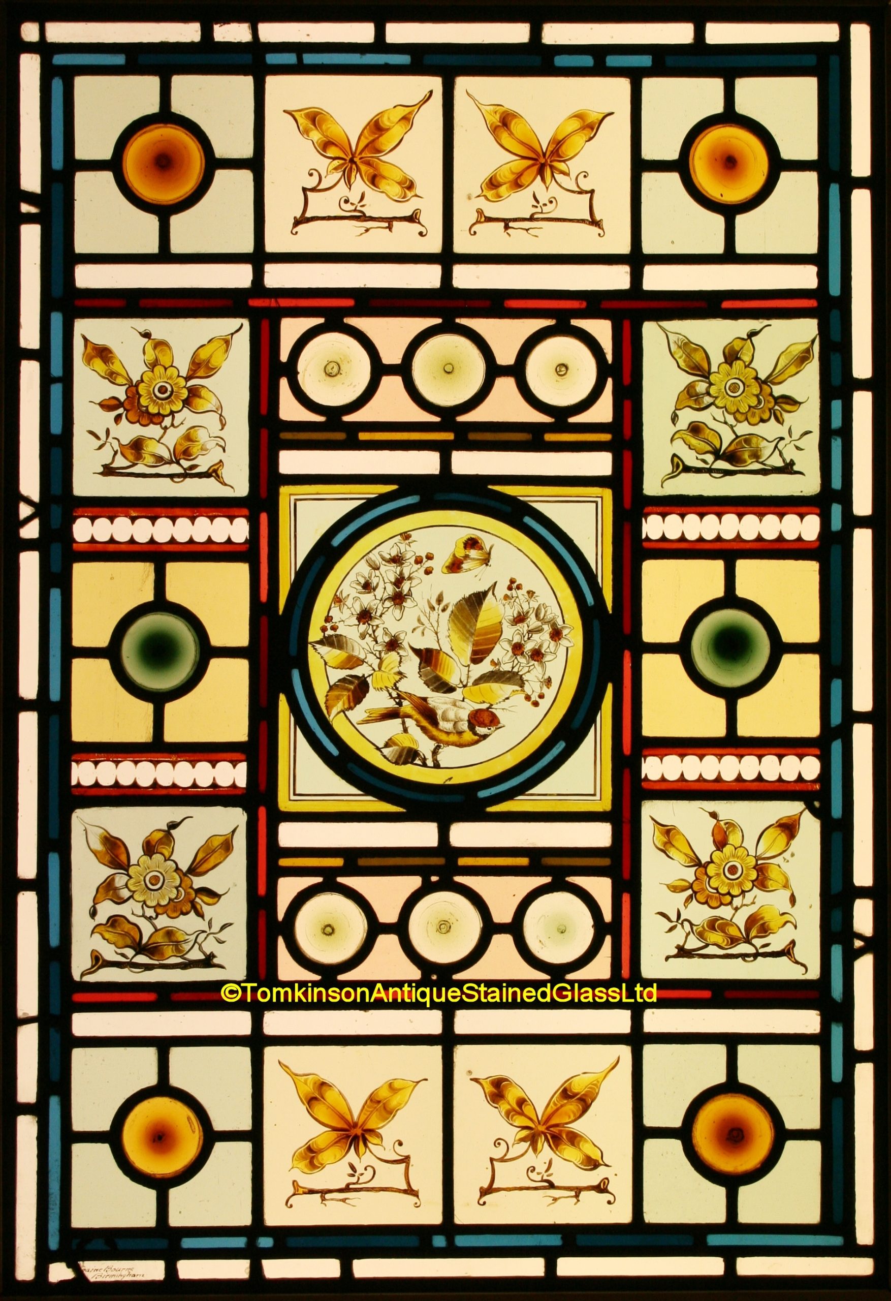 Decorative aesthetic movement antique stained glass window, leaded with a central roundel hand painted depicting a bird and butterfly, around are coloured glass bulls-eye bullions and stylised flowers and foilage. Signed “Swaine Bourne, Birmingham” bottom left border. Restoration to the outer borders, otherwise in excellent original condition and in a pine frame for handling/shipping purposes.