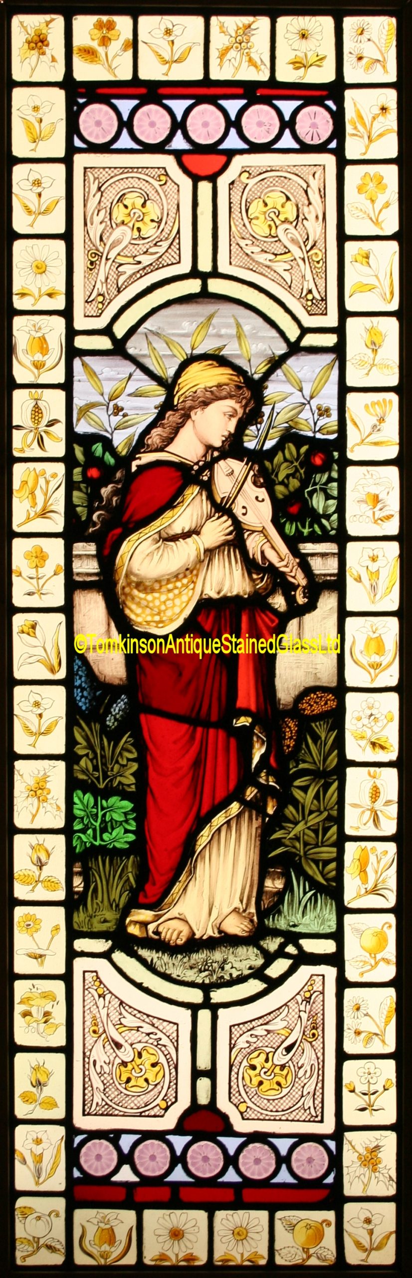 Lovely decorative antique stained glass window hand painted depicting a Pre-Raphaelite classical maiden standing in a garden and playing a violin. Leaded into the window are pink raised molded roundels and an outer border of various flower squares. With slight restoration the panel is in excellent condition.