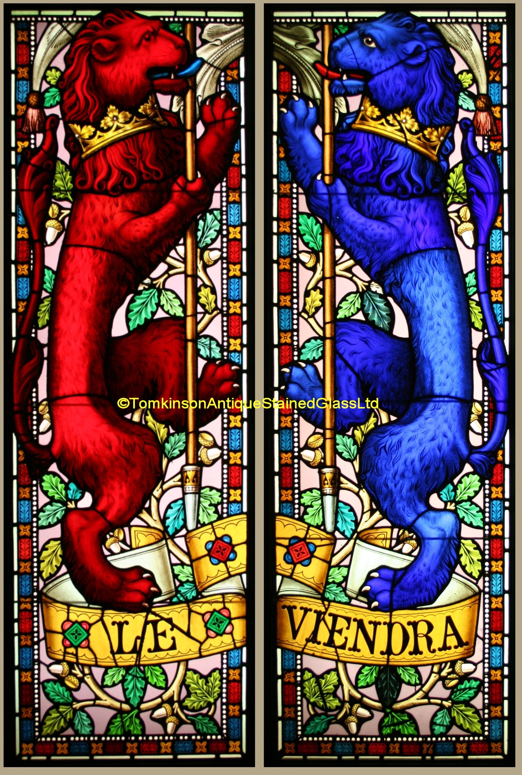 Ref: Vic559 – 2 Victorian Stained Glass Windows – Majestic Rampant Lions