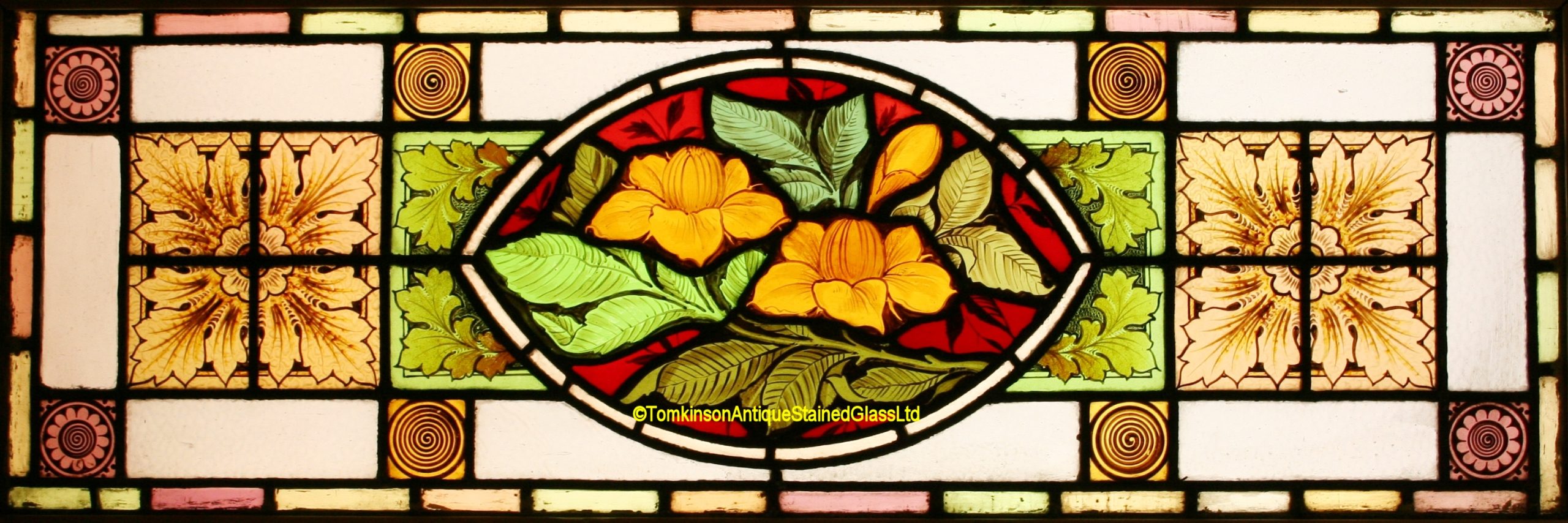 Antique Victorian transom stained glass window, lead with pastel coloured glass and hand painted depicting a central scene of branches of yellow flowers, around are stylised flowers and acanthus leaves. Lovely decorative window and in original condition.