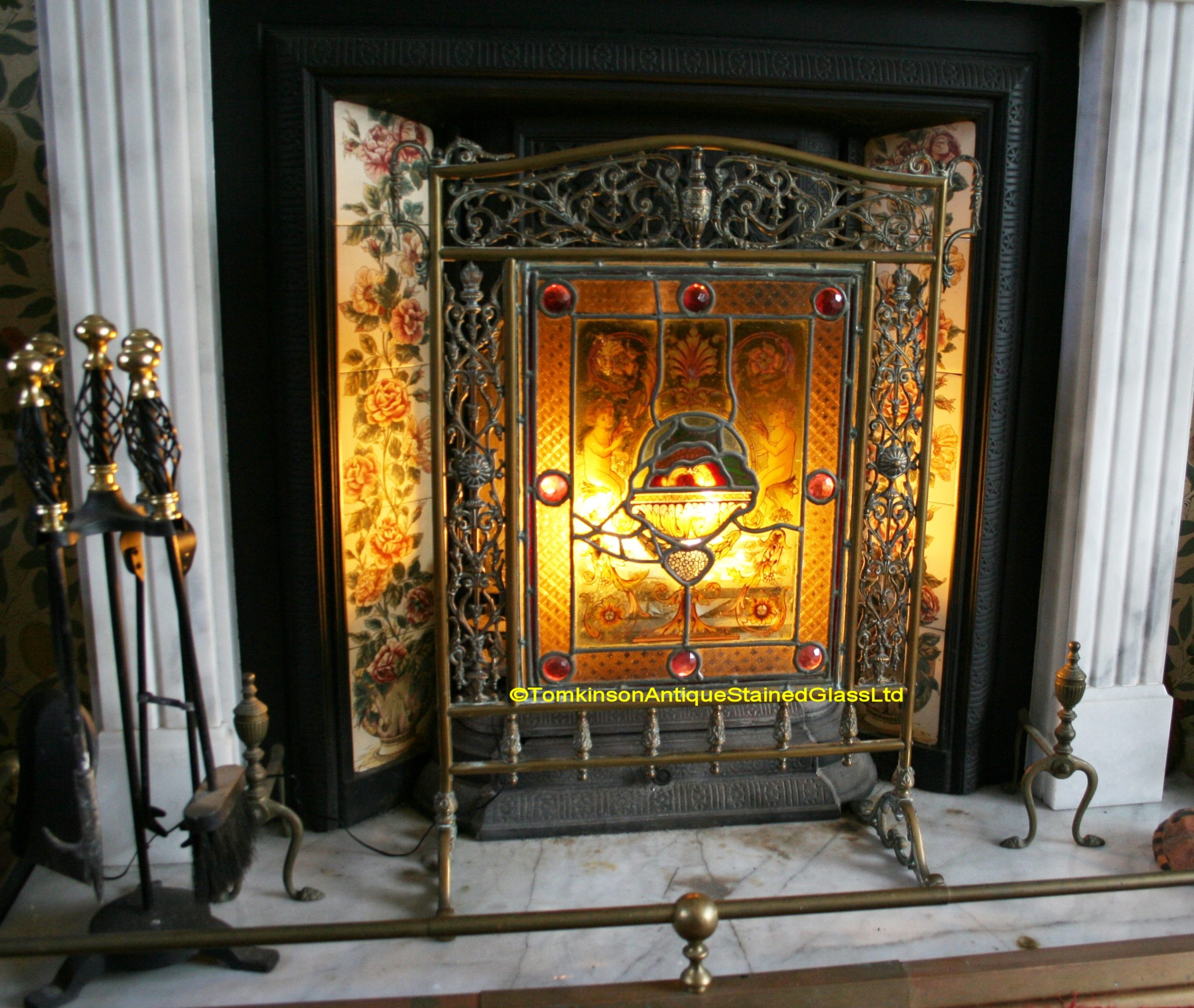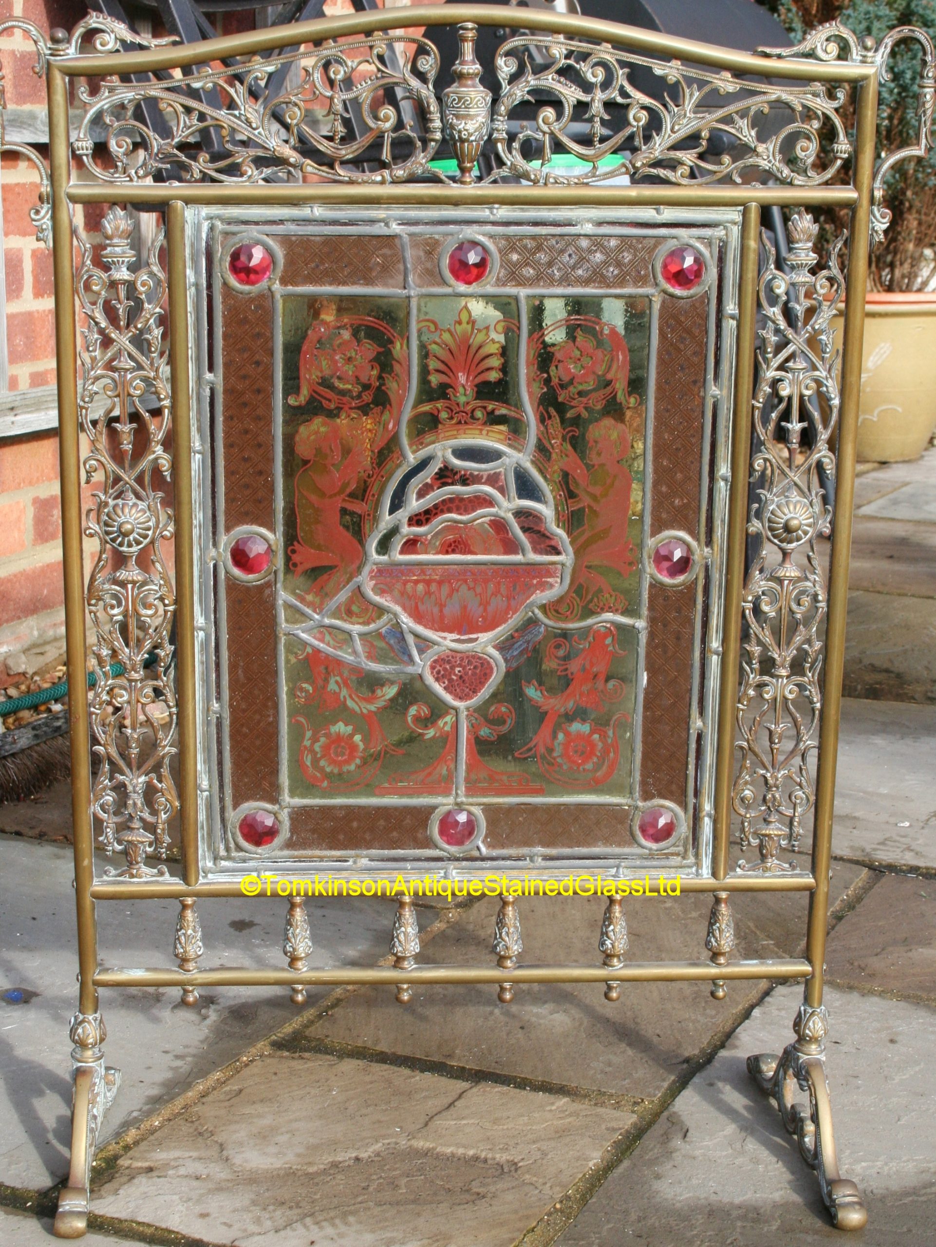 Decorative antique Victorian brass fire screen with stained glass panel hand painted depicting an urn of fruit with 2 putti either side. The Putti are holding acanthus garlands and around is a pink coloured glass border with brilliant cut jewels. Fire screen is in excellent condition and glass panel has had slight restoration keeping it in original. (Picture 7 shows the fire screen standing in the hearth backlite by fairy lights)