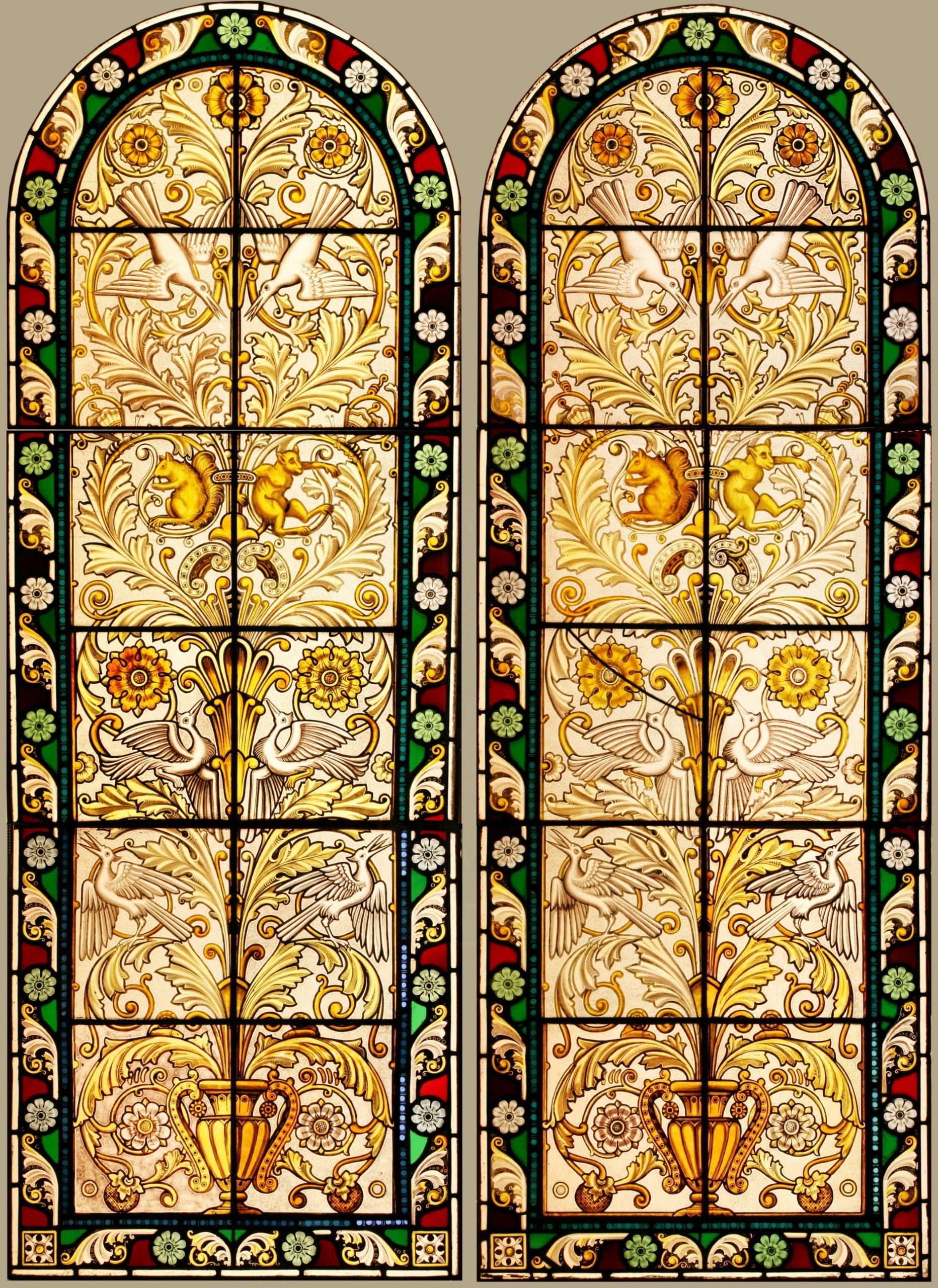 Pair of large and impressive antique Victorian stained glass windows. Each leaded with coloured stained glass and obscure glass hand painted depicting an urn with stylised flowers and foliage with birds, squirrels and monkeys on the branches. Around is a decorative flower and leaf border. Slight restoration which has kept the windows on original condition. Removed from a large villa style house in Tooting, London prior to demolition, original Oak frames available.