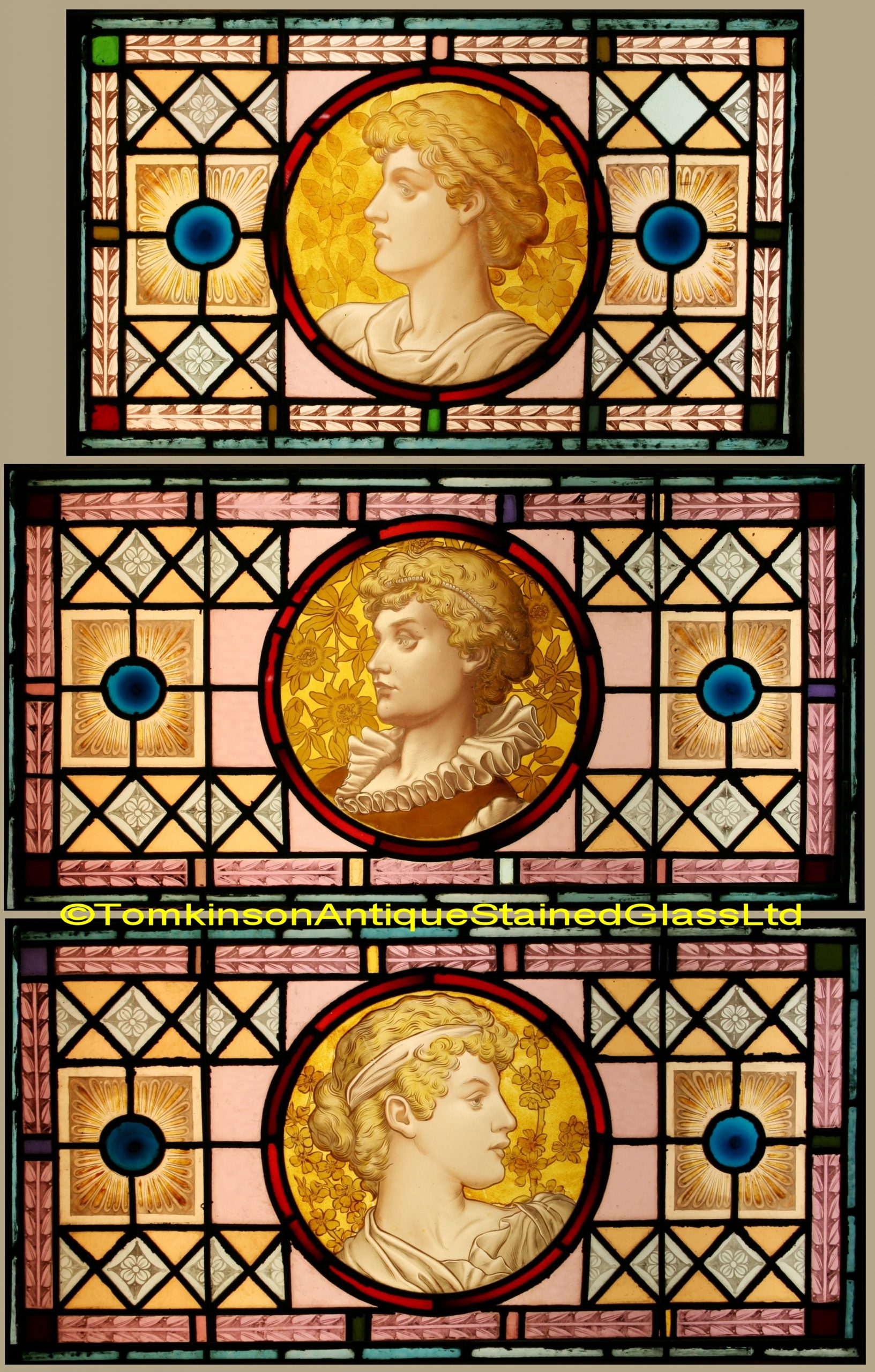 Ref: Vic632- 3 Victorian Stained Glass Windows – “Classical Maidens”