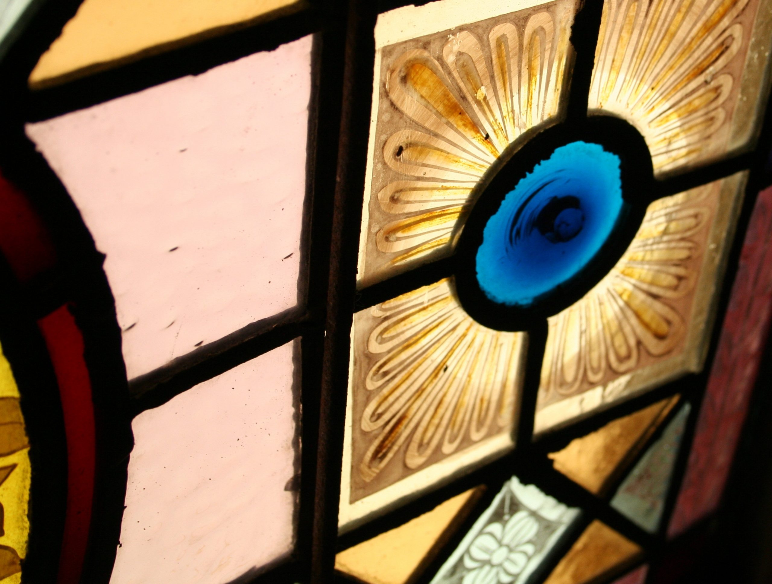 Three antique Victorian stained glass transom windows each leaded with large central roundels hand painted depicting classical maidens. Also with stylised flowers, bull’s eye bullions and coloured glass. Lovely windows, in original condition and in original pine frames.