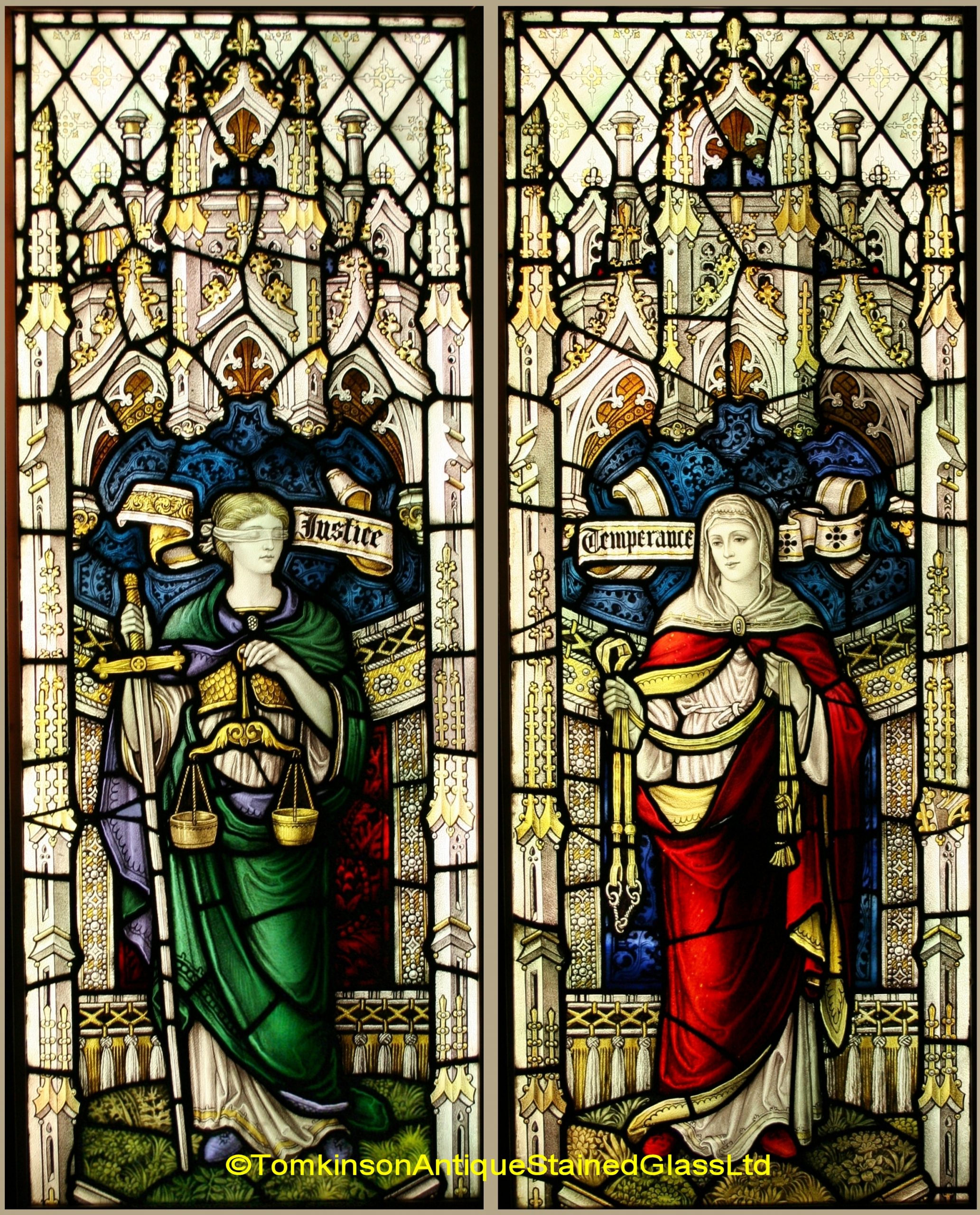 Two antique church windows, each leaded with hand painted stained glass depicting the female figure of Justice, she holds a set of scales and a large sword. Also a female figure depicting Temperance (all things in moderation).