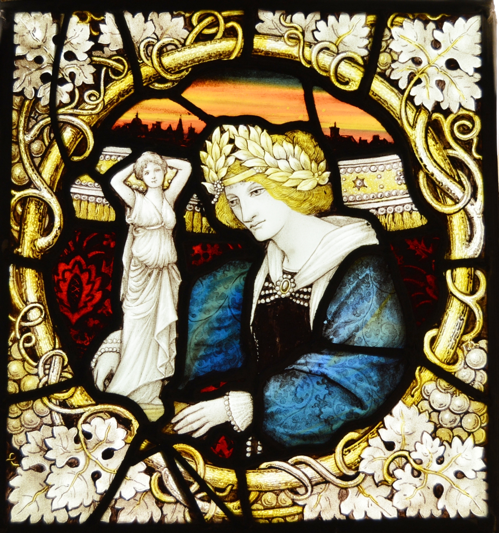Ref: Vic509 – Antique Victorian Stained Glass Window – “Calliope, Goddess of Music”