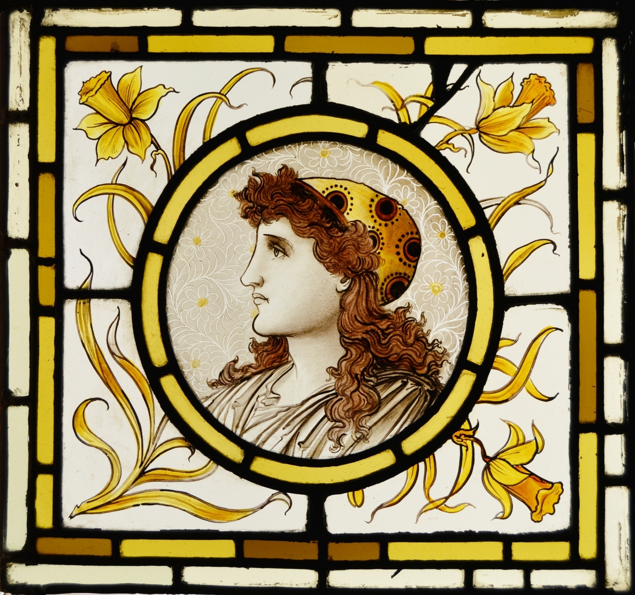 Set of 3 antique Victorian panels, each with a central roundel hand painted depicting a pre-raphaelite maiden, around are stems of yellow daffodils and various coloured glass borders.